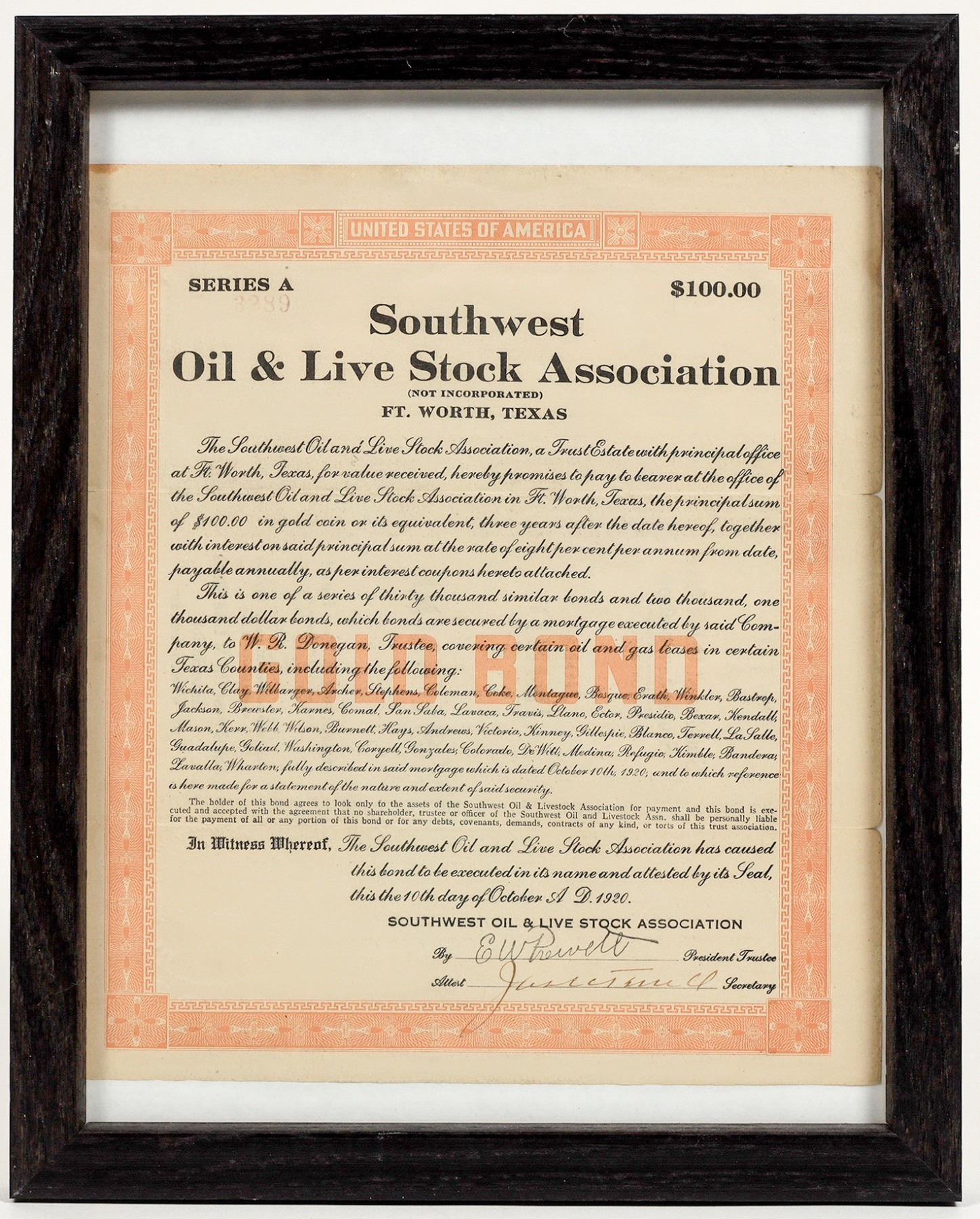 This bond was issued in 1920 for oil and gas leases in many Texas counties. The headquarters located in Fort Worth. Stamp- signed by then President E.W. Prevelt. Two folds minor foxing, edge yellowing marked gold bond. Framed 9.5 in. X 12 in. Please see photo for details.