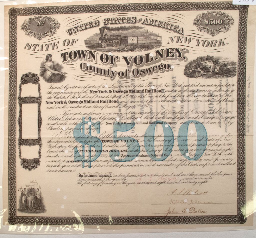 A large $100 bond issued in 1868 to facilitate the building of this railroad. Attractive Very Fine with numerous small cancel holes. Issued to J. J. Wolcott. Signed by Wolcott, Dutton and ?. Wolcott was a State Senator at the time he purchased this! Date 1867 , NY hwac 2038