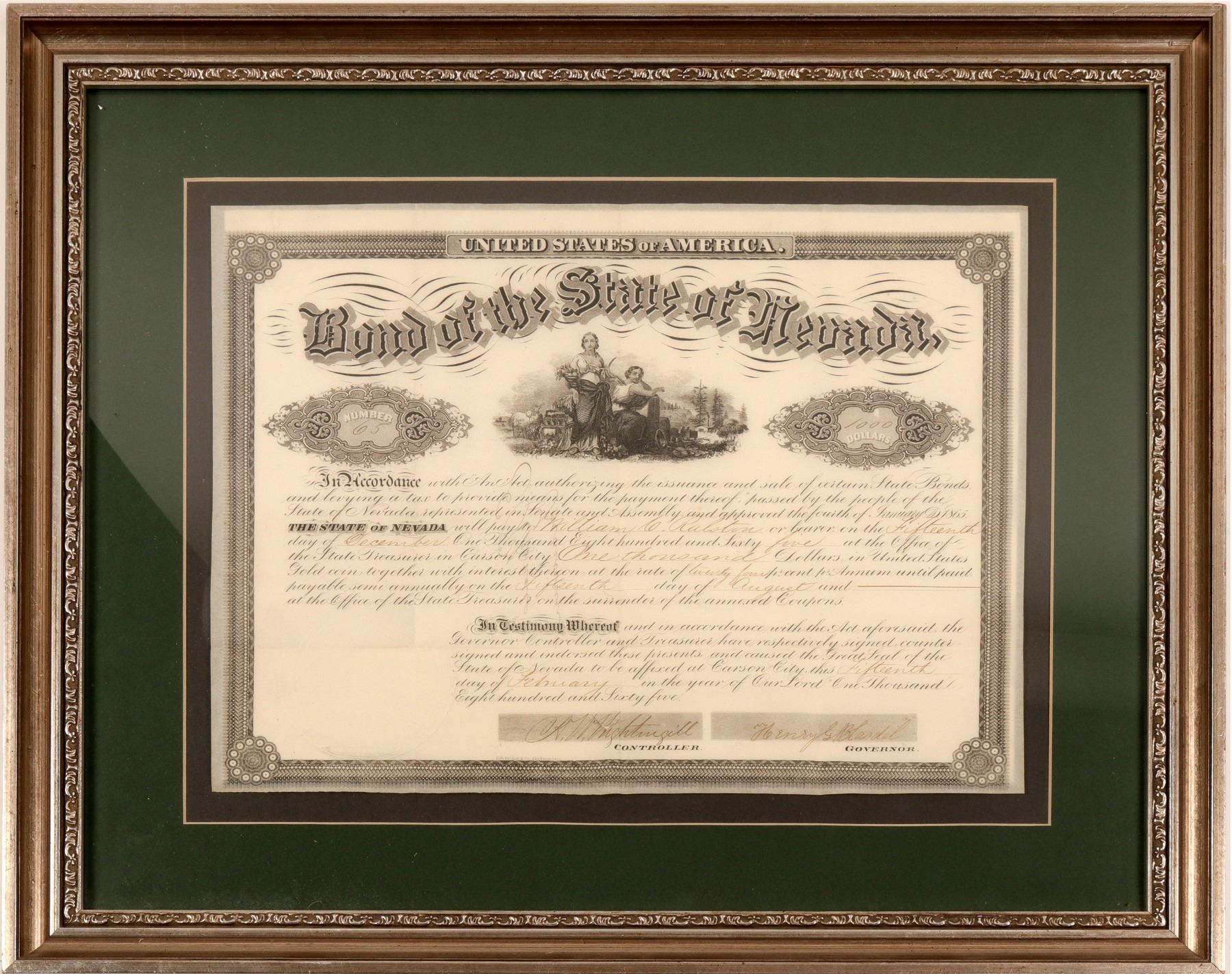 Beautifully framed 1865 Bond issued to William C. Ralston for $1000, signed by Blasdel, the first governor of Nevada. 18.5 x 22", green mat. Ralston was a founder of the Bank of California less than three months before this bond was issued.