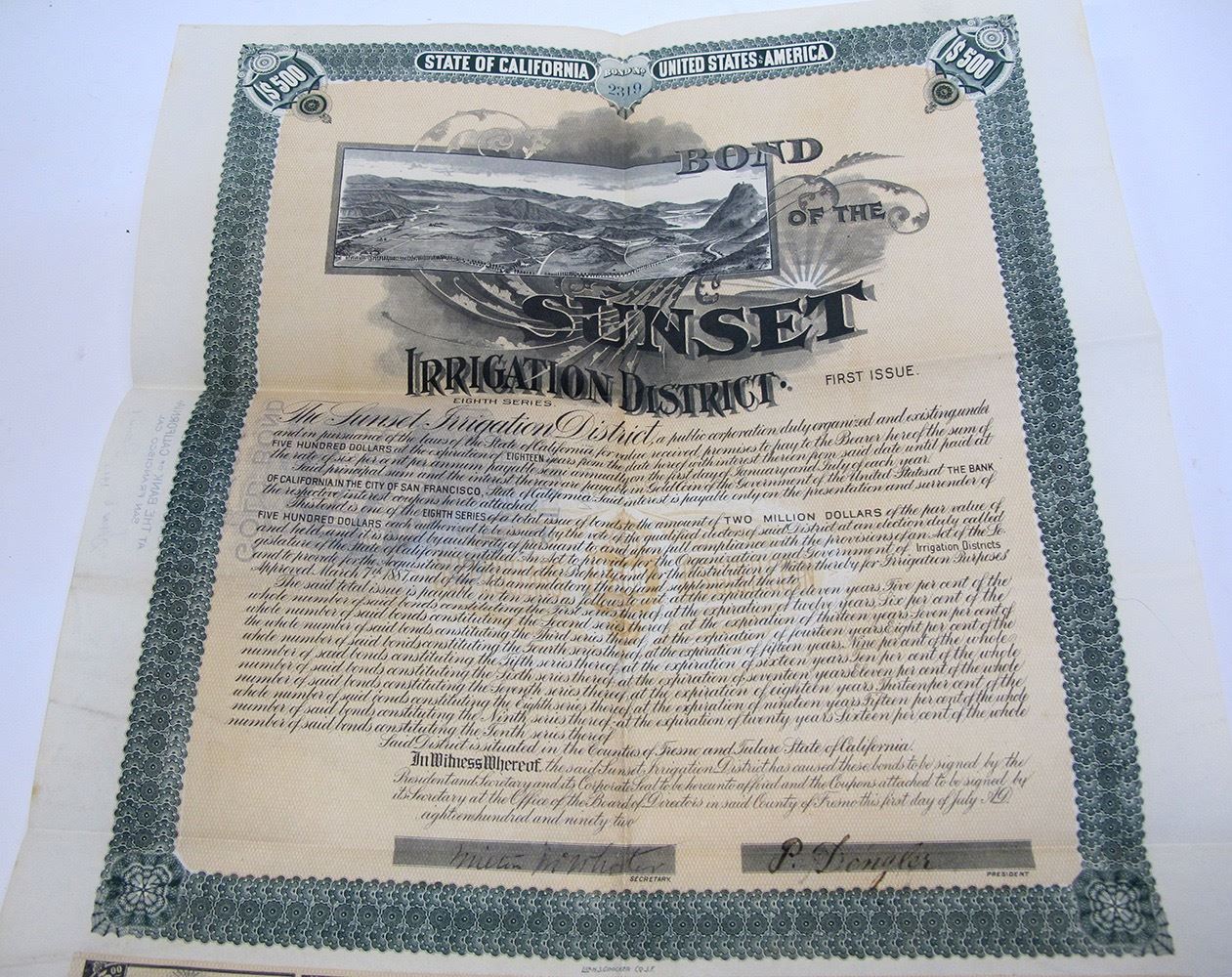 1 Rare $500 Gold Bond, No. 2319, 1st Issue, 8th Series. Very detailed, gorgeous vignette of landscape with mountains and appears to be a tree-lined street. Beautiful ornate blue border. 35 coupons attached. Signed by President P. Dengler, 15.5" x 13.5". Date: 1892 Location: Fresno County, California HWAC # 53742