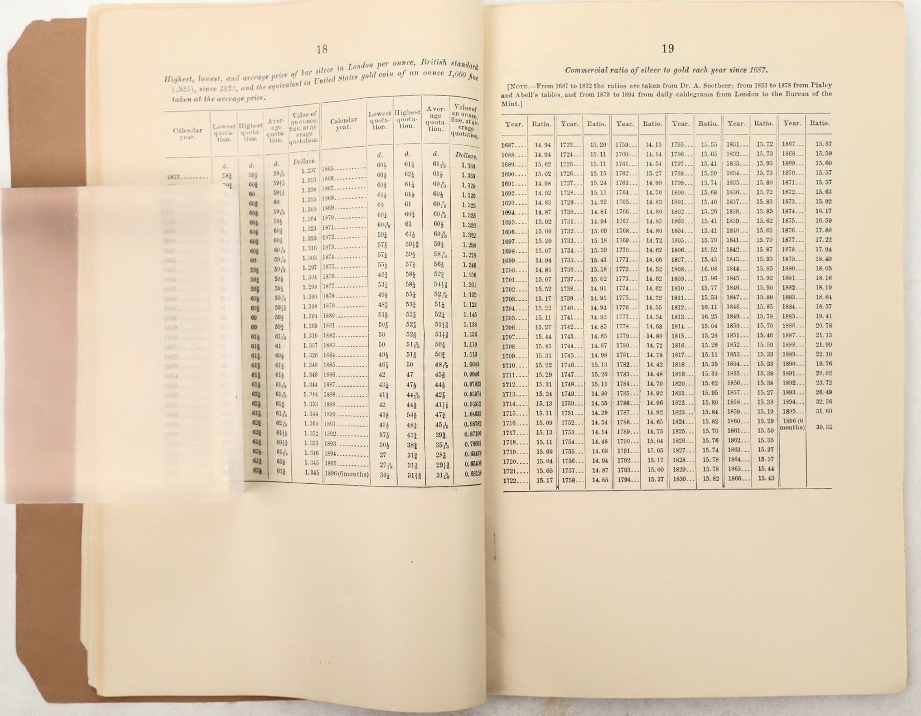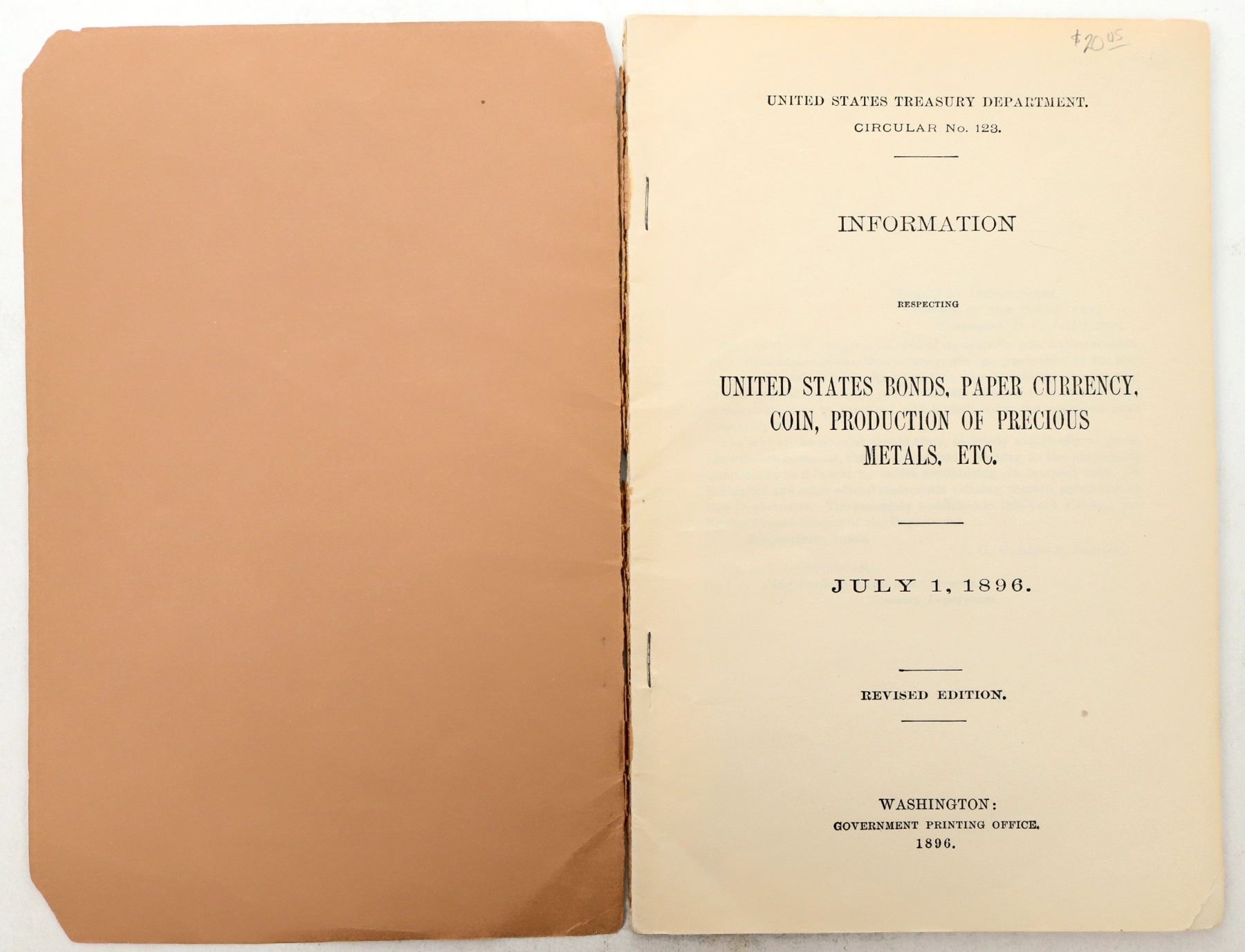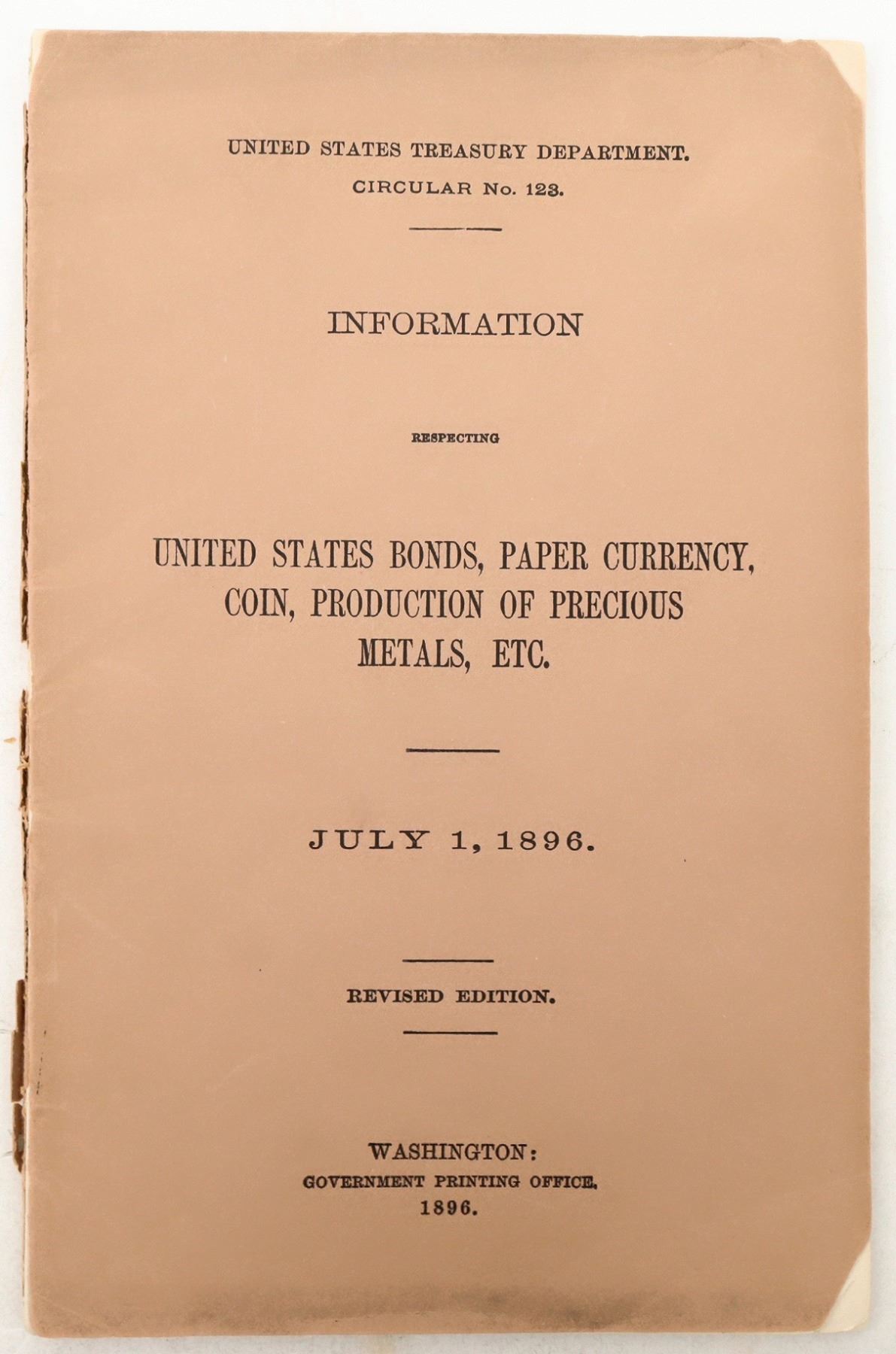 Published by the United States Treasury Department July 1, 1896. Pamphlet is 58 pages, 6 x 9 inches, cover detached but in good condition. Information respecting United States bonds, currency, coinage, and the production of precious metals.