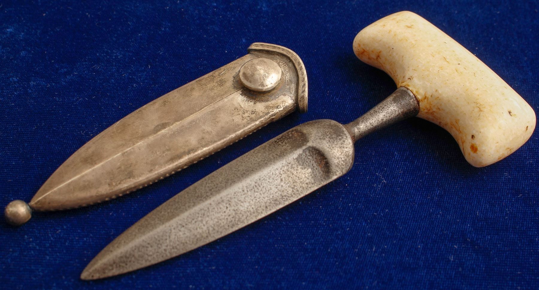 Plunge type, with metal sheath. 6". Blade is 1" wide at widest. Mother of Pearl circle decoration at top of handle. Weighs 6.5 ounces. A serious weapon! State: City: HWAC#: 47216 Date: