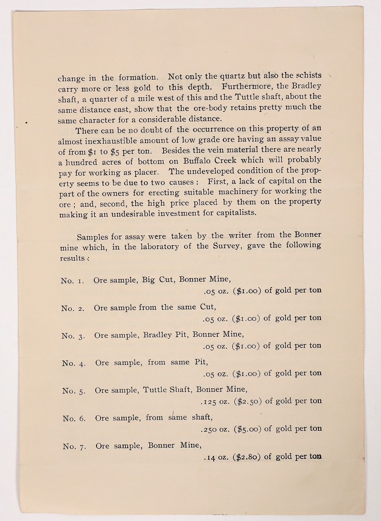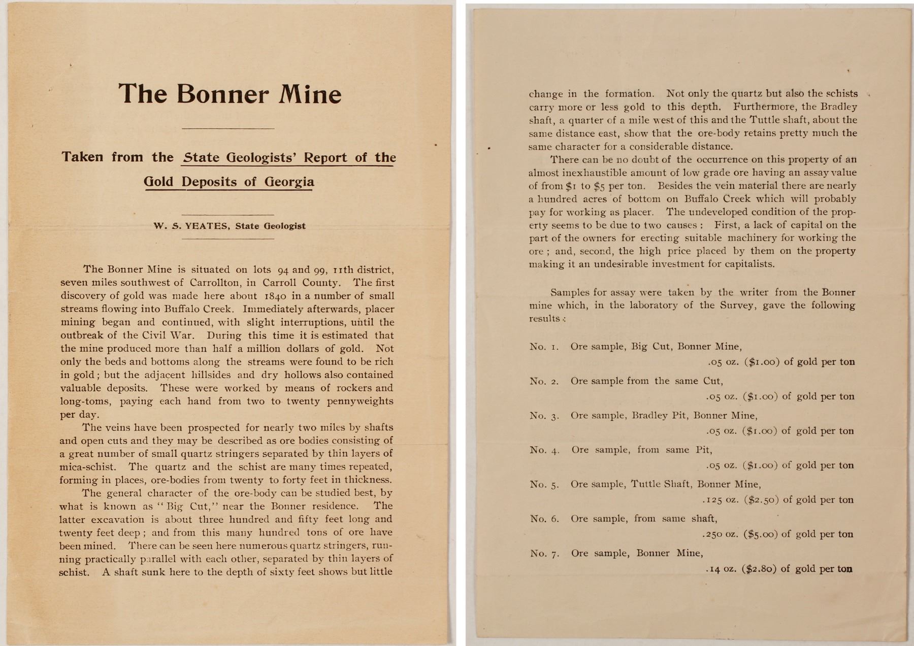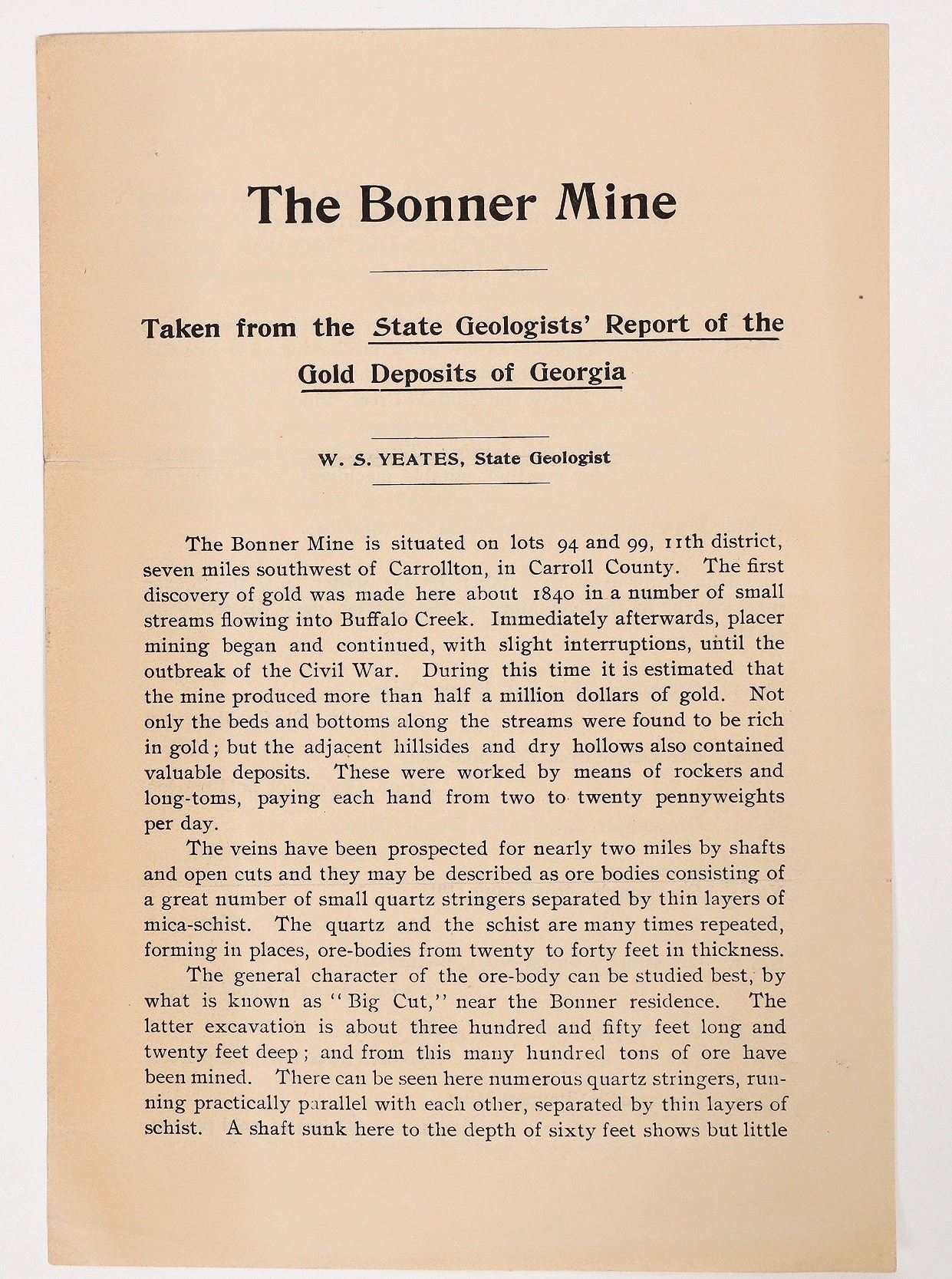 Two sided. 8 x 5.5" Horizontal fold, two pinholes, slight bend on bottom right corner. Overall in nice condition. Taken from the "State Geologist's' Report of the Gold Deposits of Georgia" by Yeates. In 1830, gold was discovered at Pine Mountain, near the future site of Villa Rica. Later the vein of gold was found to extend from the northeastern corner of the county to the southeastern corner. Some gold deposits were found near Carrollton on Oak Mountain, but the most important were discovered on the large plantation owned by Zadok Bonner, about eight miles southwest of Carrollton. The Bonner mines began operation about 1840, and more than a half million dollars in gold was removed before 1860, leaving the "Big Cut," 350 feet long and 20 feet deep, near the Bonner residence. The placer method was used to sift the dirt for traces of gold. Zaddock Bonner, Jr., was one of the wealthiest men in Georgia before 1860. He discovered what became known as the "Bonner Bonanza" when he hit gold in Carroll County, Georgia. He was known to have been worth over three quarters of a million dollars before the "Civil War". Gold from his mine was used on the dome of the Georgia State Capitol. Georgia Carrollton