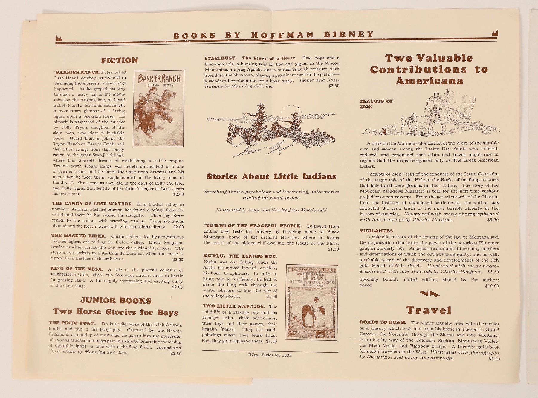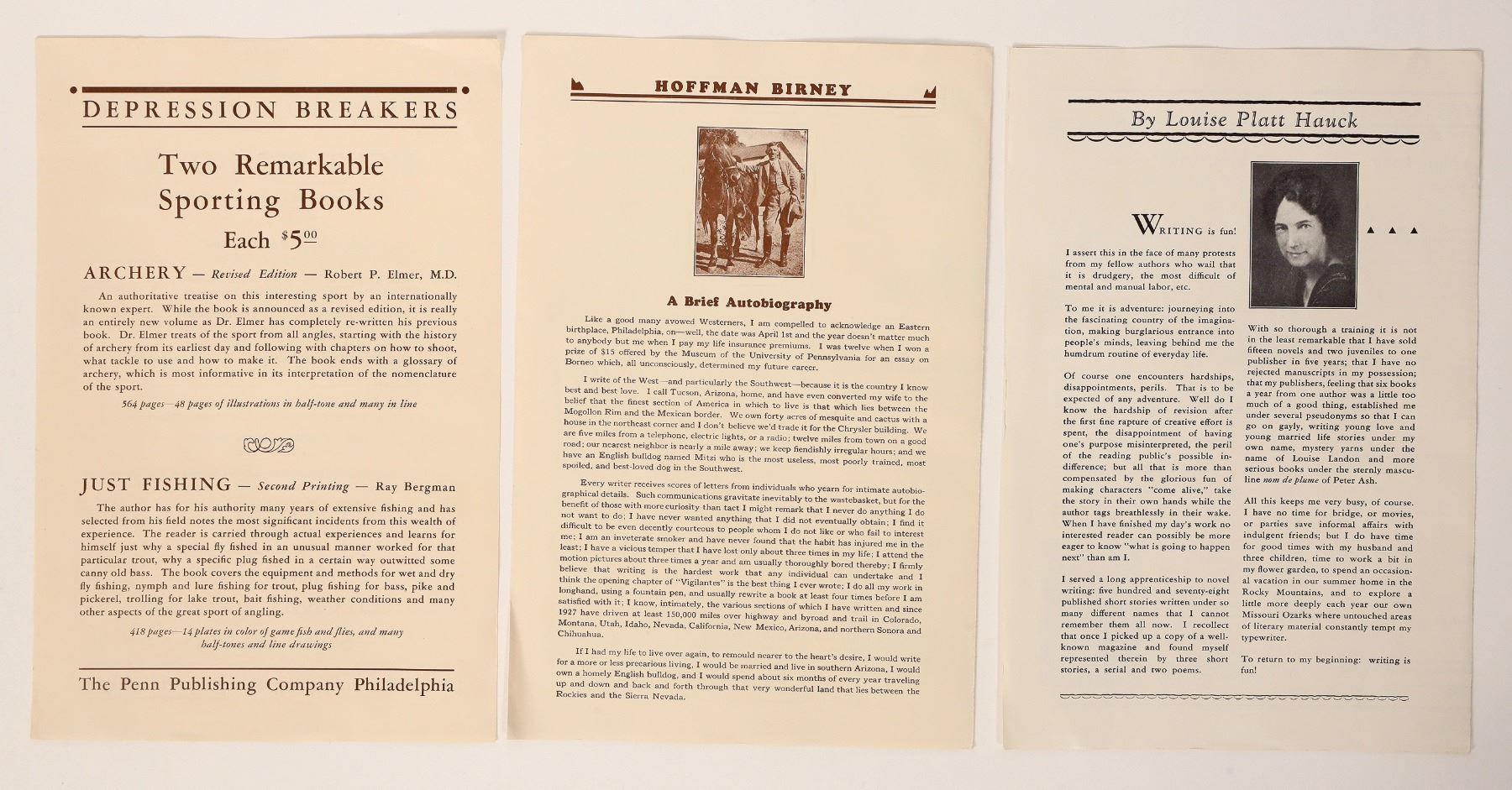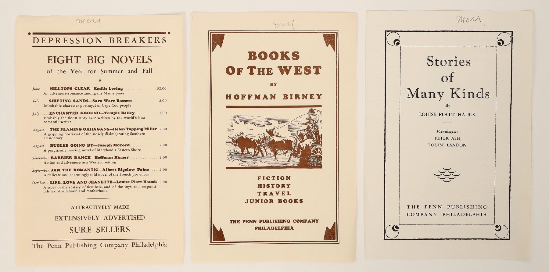 3 c. 1933 Penn Publishing book sales flyers. Books of the west, stories of many kinds, Depression breaker novels. Pencil writing on covers.