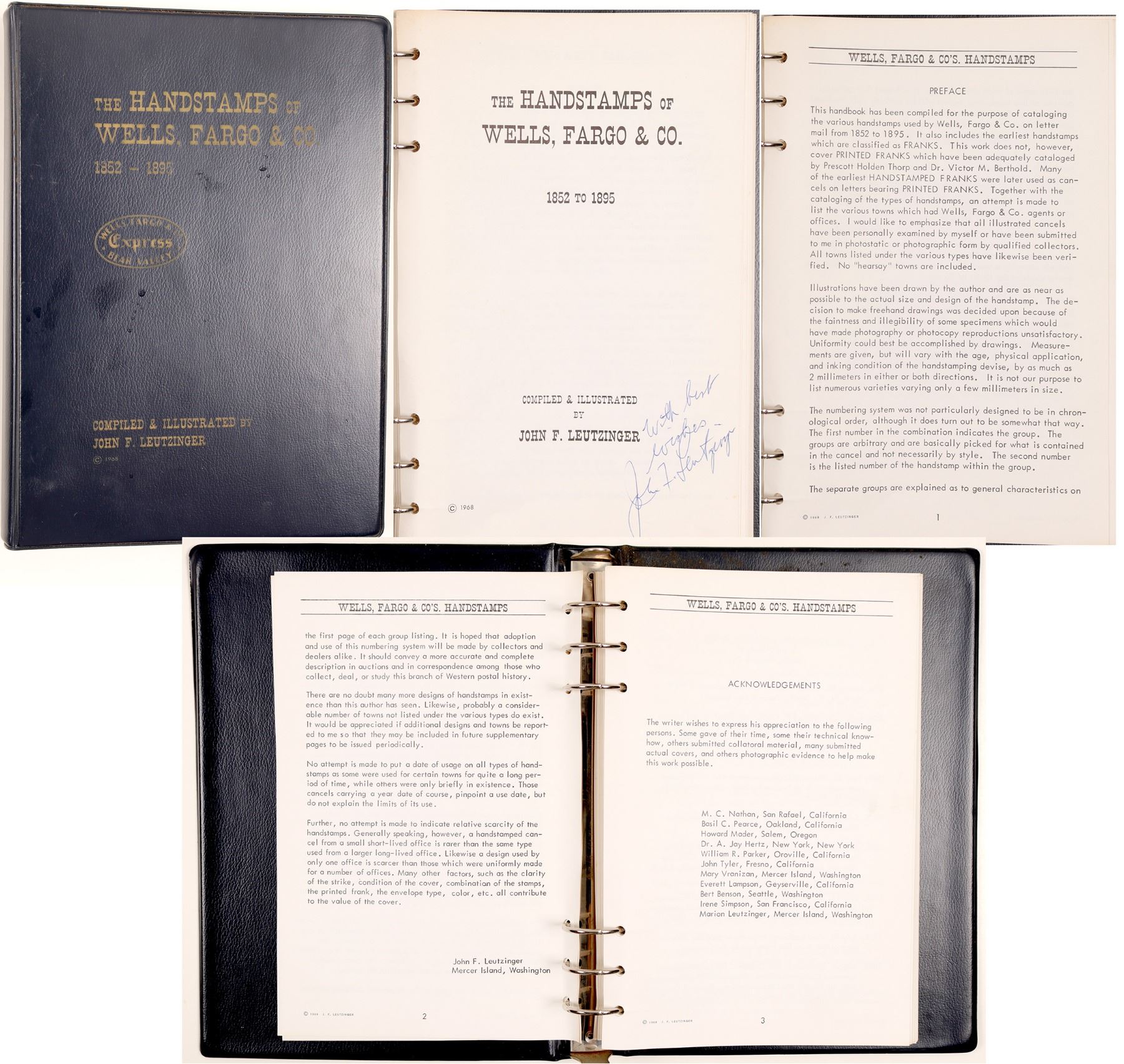 Here is a really valuable tool, for the collecting trade. It is a reference guide showing all of the Wells Fargo & Co's, hand stamps used from 1852-1895 where they has offices. It shows all of the town cancellations, that could be verified at that time. It includes towns, big or small, from territories, and from states. This is great reading and eye opening, just tuns of information for the hungry mind of a collector. Don't miss this chance to discover the golden information in here. Signed by the author, John F. Leutzinger. Perfect condition, and very rare !! (RH).