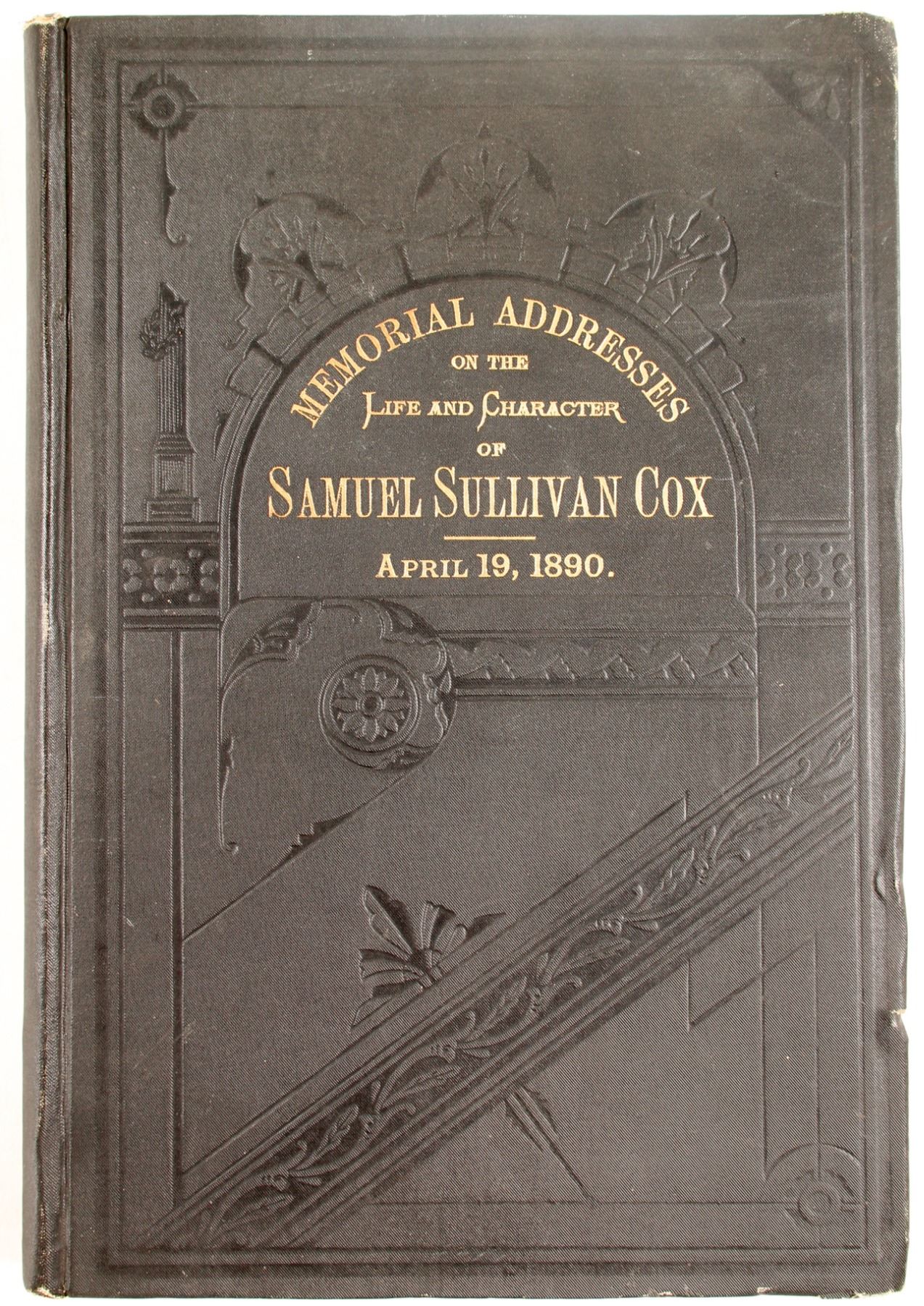 Hardback book of Memorial Addresses on the Life and Character of Samuel Sullivan Cox, April 19, 1890, a representative from New York, pp.264. Slight foxing & wear on book. 7.5 x 10".