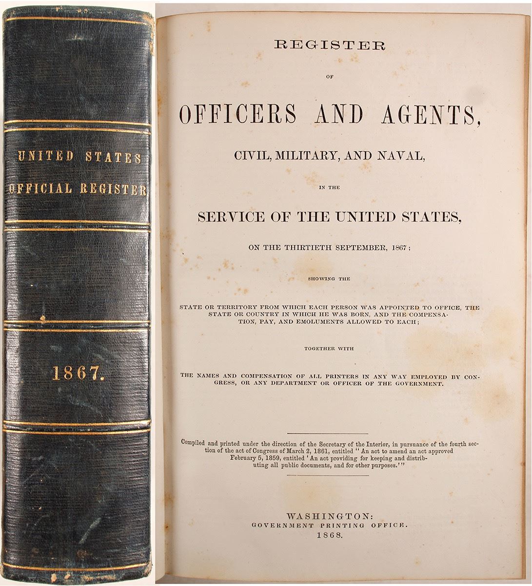 Hardback book, Register of Officers and Agents, Civil, Military , and Naval, in the Year 1867. Some fraying at edges of cover, pages legible, slight foxing on first five pages. pp. 877. 6" x 9.5" Date: 1867 Location: HWAC# 63420