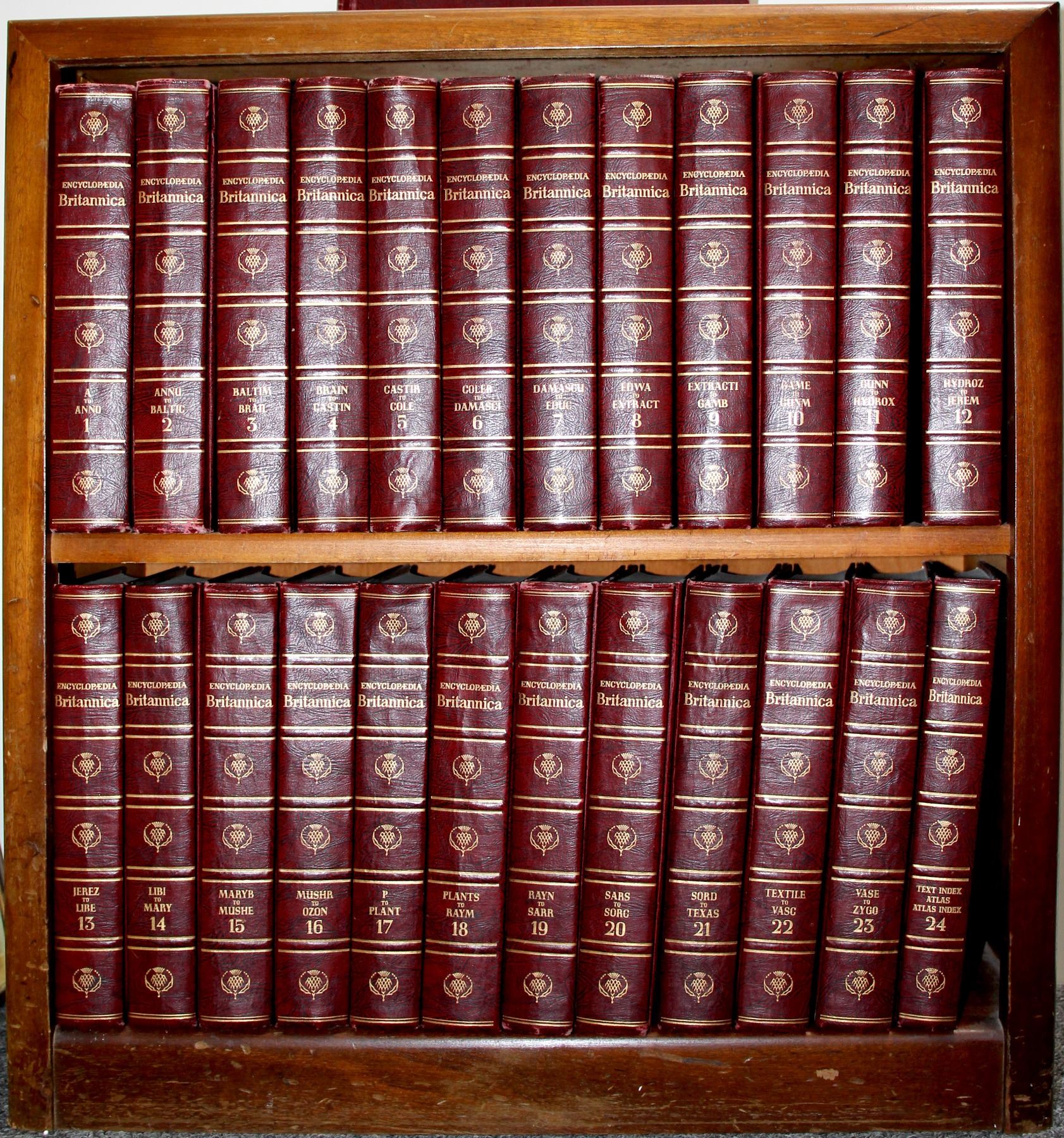1) 24 volume set of the Encyclopedia Britannica and it comes with a book case as well. Exceptional source of information, and a wealth of knowledge. Come for the gold, and discover the adventures. It even shows all the top Generals in the Civil war, on both sides, very cool; 2) From the same company, "The Word Atlas", maps and descriptions, all kinds for great reading for hours. Fantastic colored maps with intricate detail. Imagine, you can go to all these places now, without leaving home. Good to perfect condition.