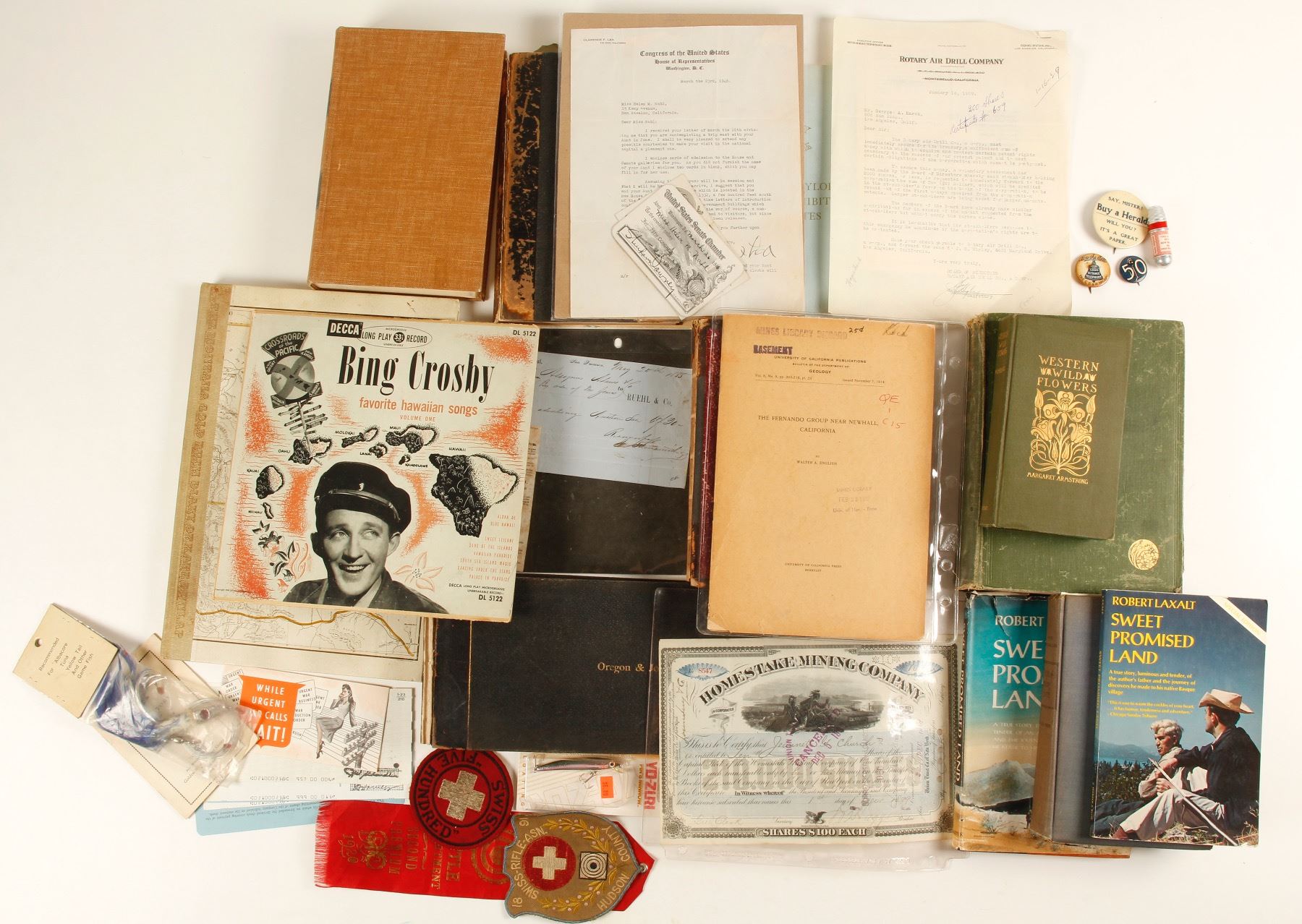 Grab Bag of Americana. Books; Records; includes Homestake Mining Company stock cert. signed by President Haggin; Oregon & Joraquipa Mining Co.; Bing Crosby favorite Hawaiian Songs, Volume One; The Montana Gold Rush Diary of Kate Dunlap, (Hardback); & much more in this lot. Approx. 25 pieces. Date: City: State: HWAC# 78307
