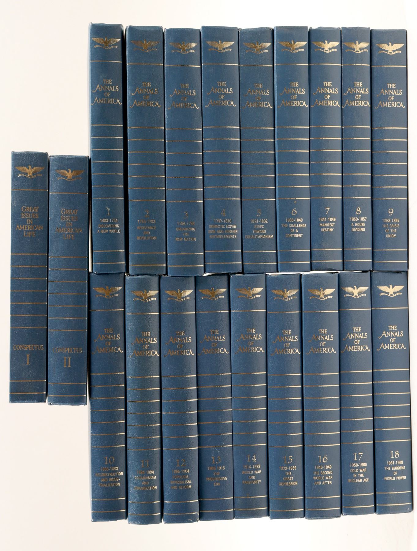 Here is a really great item, from the " Old Days". It is a complete 18 volume set of " The Annals Of America ". It tells the complete history of America, from 1493-1968. Fantastic reading and a great educational tool. Considerably more information, than the computer provides you on the exact same subjects. Right in your own hands !! As you read it, you will be saying" I didn't know that or this, wow this is GREAT !! " Come one, come all...Join the adventure" Discover America " again. Perfect condition, and very desirable.. (RH).