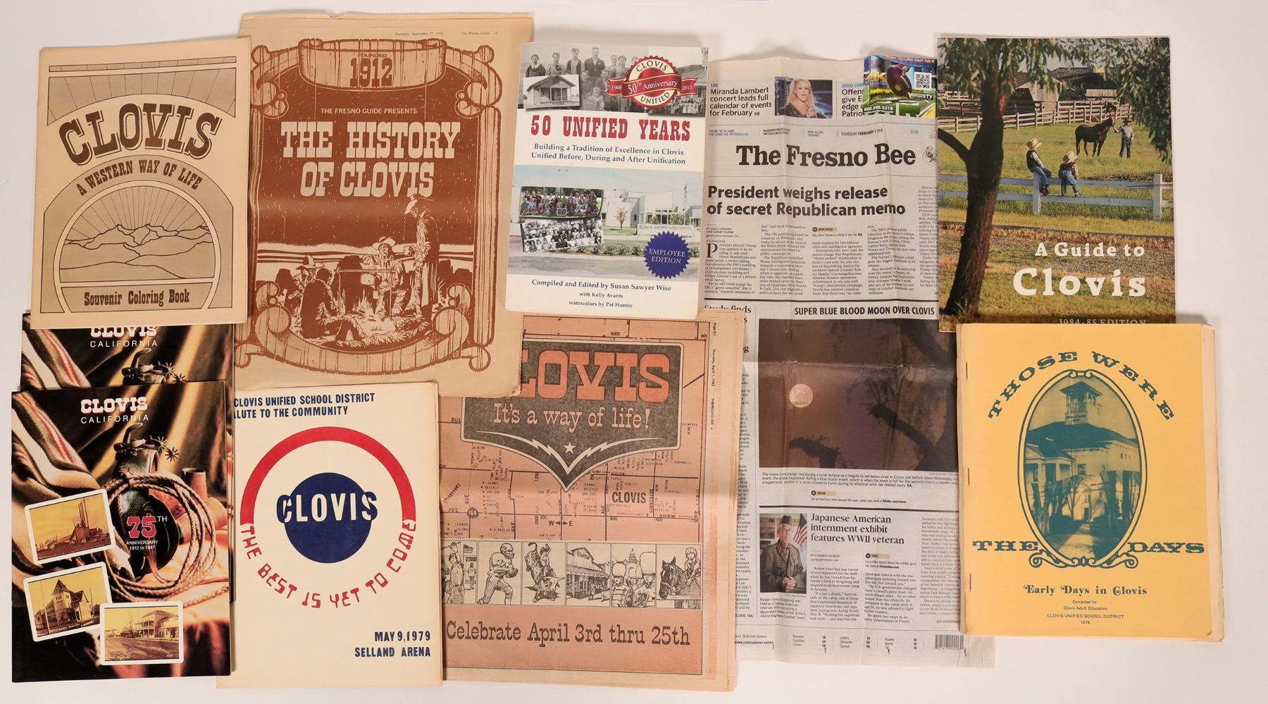 50 Unified Years Clovis by Wise, 2011; the History of Clovis periodical The Fresno Bee; A Clovis Unified School District Arena, 1979; A Guide to Clovis 184-5; Those Were the Days by Clovis Adult Education, 1976; Clovis A Western Way of Life coloring book by 1981; Clovis California 75th anniversary.