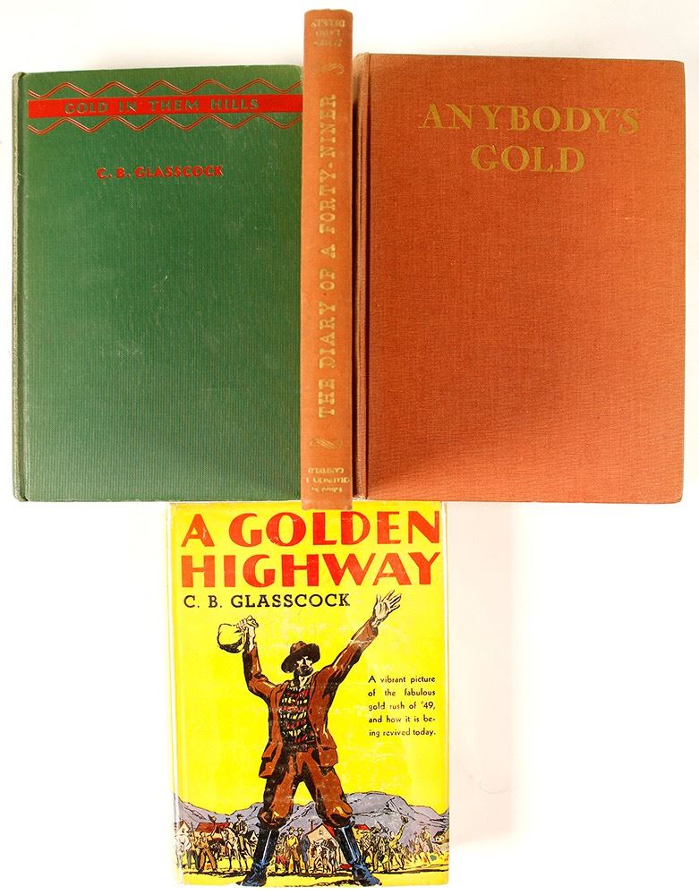 lot of 4 hardback books. "Gold in Them Hills" by C.B. Glasscock pp.330 ; "Anybody's Gold" by Joseph Henry Jackson, pp. 455; "A Goldwen Highway" by C.B. Glasscock, pp.333; & "The Diary of a Forty Niner" by James Ladd Delkin, pp. 192. HWAC# 59647 Date: Location: California/Nevada