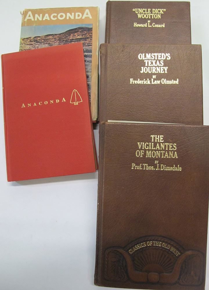 Lot of 5 books 1)The Vigilantes of Montana by Prof. Thos. J. Dimsdale; embossed, leather bound, a reprint 1981 from 1866 edition by Time Life Books, has water damage in upper right corner; 2) "Uncle Dick" Wootton by Howard L. Conard, embossed, leather bound reprinted 1980 from the 1890 edition, nice condition 472 pp; 3) Olmsted's Texas Journey by Frederick Law Olmsted, leather bound, embossed, reprinted 1981 from the 1857 first edition. Nice condition, 516 pp; 4) Anaconda by Isaac F. Marcosson, 1957, cover is beginning to detach, 370 pp, extra copy of this book included. 5.5" x 8.25" HWAC# 62011 Date: 1957 Location: Montana