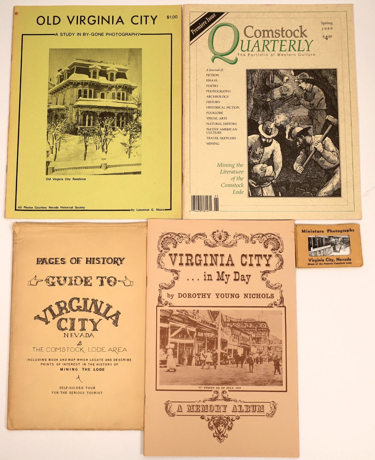 1) “Guide to Virginia City”, Nevada. & The Comstock Lode Area, by Pages of History, Sausalito, Ca., 1959 - a self-guided tour for the serious tourist, wherein are described points of interest in the history of mining the lode – Accompanied by a Guide map, 22 ½W x 17 ½”H – Booklet, 6” x 9”, has 55 pages Comes with envelope 2) “Virginia City in My Day”, A Memory Album, by Dorothy Young Nichols, 1973 - Contains 56 photos with captions – (7” x 11” SC, 37 pages) 3) “Old Virginia City”, a Study in by-gone photography, by Lawrence G. Means – 44 historic photos – (8 ½ x 11, 24 pgs.) 4) (Premier Issue)¸Spring, 1989, Mining the Literature of the Comstock Lode –Contains article entitled “Changing Vistas – Gold Hill & the Crown Point Revine”– (8 ½” x 11”, 48 pages)