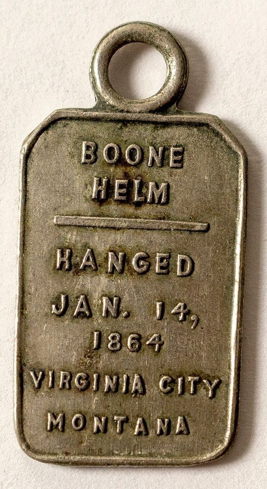 Territorial tag for a man named Boone Helm that had been hanged Jan. 14, 1864 in Virginia City Montana. Very early Montana piece that reflects the attitude of early V.C. Textured white metal that resembles the shape of a coffin with a loop on the top. Spectacular piece. 1" Tall. Date: 1864 Location: Virginia City, Montana HWAC# 40828