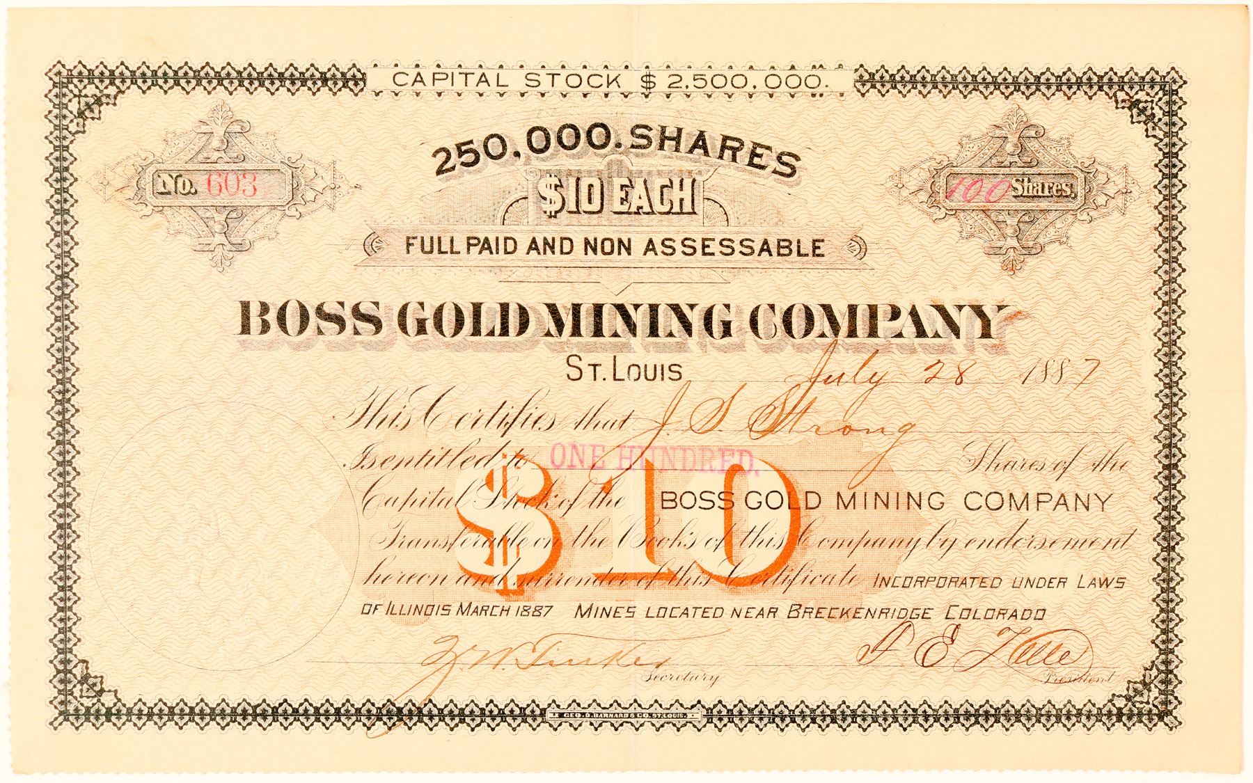 "Mines Located Near Breckenridge Colorado" (printed at bottom right). Not listed by us before. Inc. in Illinois. No. 603, issued for 100 shares to J.S. Strong on July 28th, 1887. Signed by the president (F.E. Zelle) and secretary. Not cancelled. Ornate border and logo, pink background. Printed by Geo. Barnard & Co., St. Louis. 6.25 x 9.75" Horizontal and vertical folds. The 1883 Mining Directory does discuss a Boss Mine situated on the east slope of Kelleher Mountain, and on Rock Creek, Wilkinson District. This company is likely a later reorganization for that property. () Ken Prag Collection