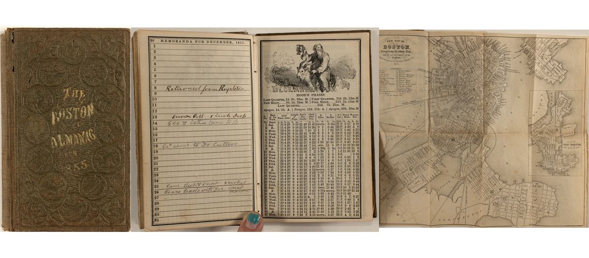 The Boston Almanac for the Year 1855. Volume XX. By Damrell & Moore and George Coolidge. Published by John P. Jewett & Co., 117 Washington St. Cleveland, Ohio. 196 pages plus advertisements. Fold-out map of Boston. Green boards. A few of the Memoranda (for November and December) have handwritten entries, most talking about the weather. Condition: wear to boards and toning. Rarity: [i]City: County: State: MADate: