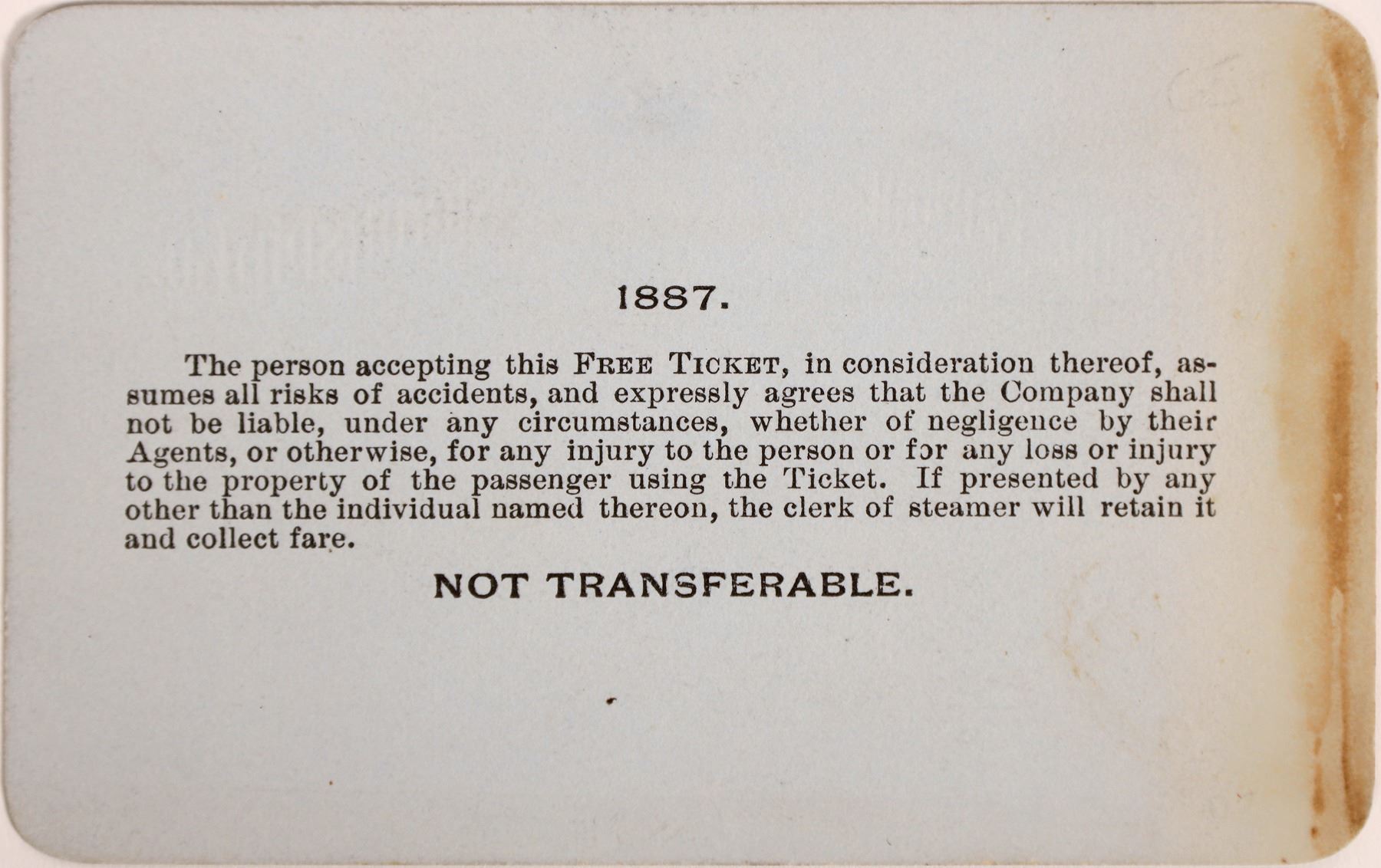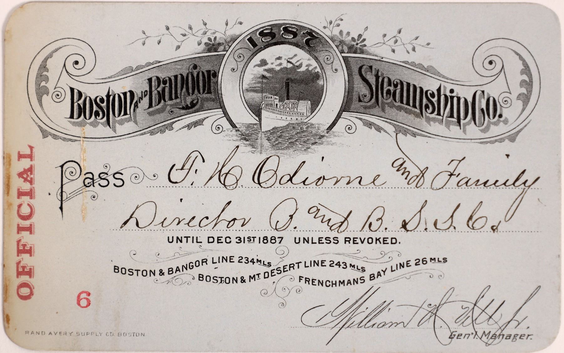 Low pass no. 6, issued for 1887 to FH Odiorne, director of the company. Preprinted signature of the general manager. Black and red print with steamship vignette, printed on blue cardstock. Printed by Rand Avery Supply Co. Staining on front left (and right reverse). Company lists the lines operated: Boston & Bangor Line (234 miles); Boston & Mt. Desert Line (243 miles); and Frenchmans Bay Line (26 miles). Possibly the oldest steamship line in the US, dating back to 1824. Boston Massachusetts