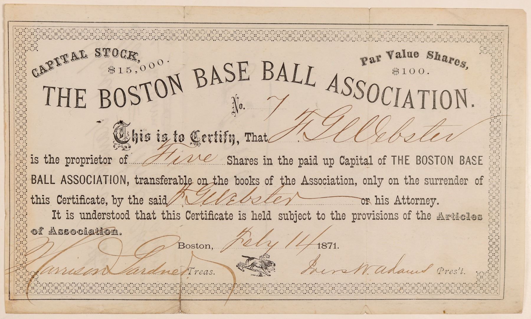 # 7 for 5 shares ($500) to FG Webster. Signed by Harrison Gardner and president Ivers W Adams. Dateline Boston 1871. Ivers was the man who brought major league baseball to Boston in 1871. Very heavy folds have been repaired.