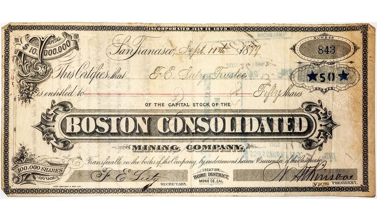 Location: Bodie Mining District, Mono Co., Cal. Inc. in California, July 14, 1879. Dateline San Francisco, Sept. 11th, 1879. No. 843, issued for 500 shares to F.E. Luty. Signed by Luty as secretary and Atkinson as vice president. Not cancelled. Printed by Britton & Rey, SF. Reverse has stamps for 3 assessments. Work on the Boston Consolidated was progressing rapidly in 1880, according to Burchard, with sufficient ore in the two drifts open to keep a 10-stamp mill busy. The Boston Consolidated was separated from the Last Chance by a double compartment incline shaft, which was 300 feet in depth. The company was making arrangements to work the mine on an extensive scale in 1880. Folds, pinholes and toning. Rare.