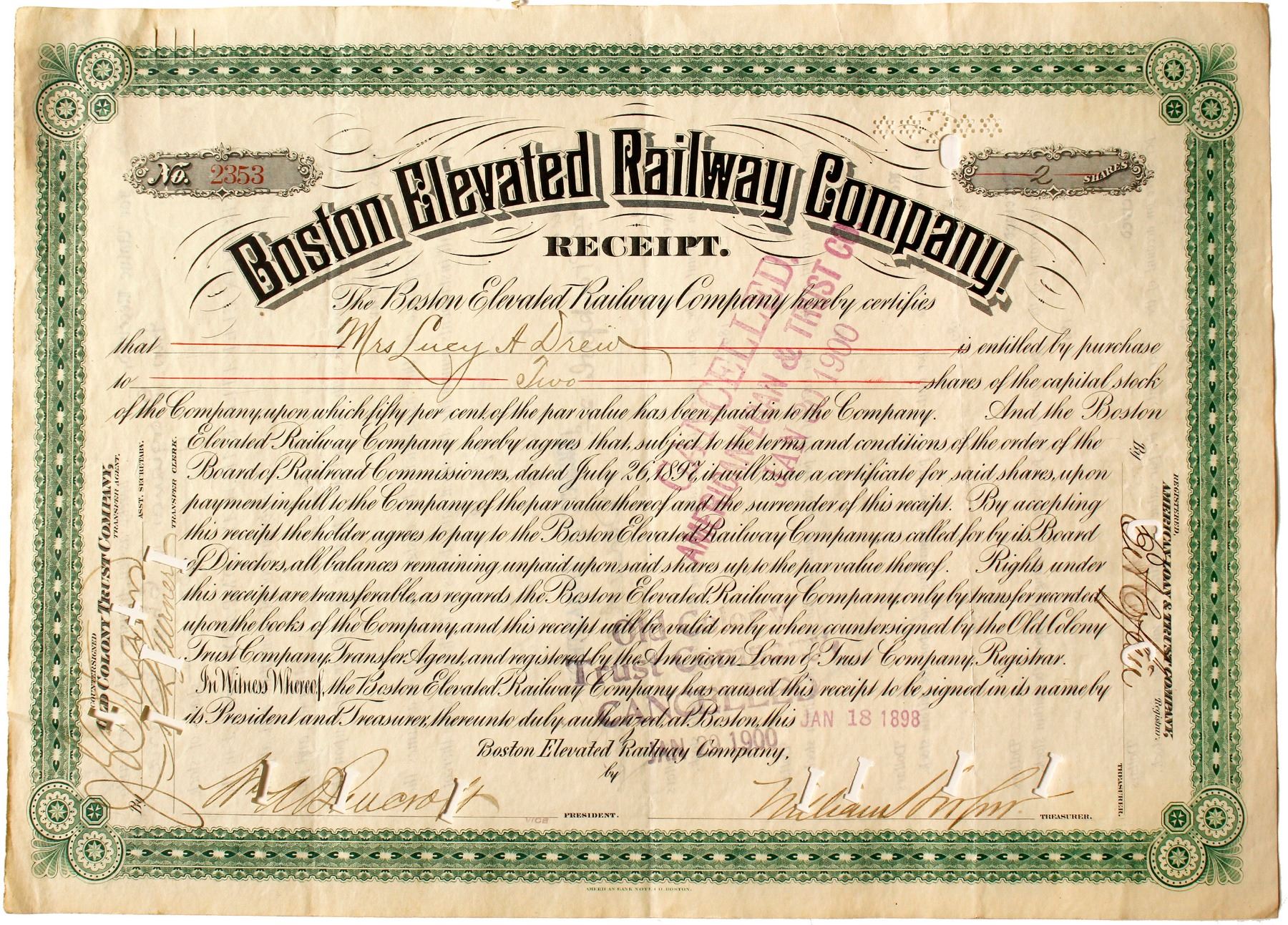 Cancelled on January 29, 1900 receipt number 2353 dated January 18, 1898 for purchase of two share of Boston Elevated Railway Company by Mrs. Lucy A. Drew. Printed by American Bank Note Company. Streetcar and railroad founded in 1894, above and below and on the streets of Boston. Ken Prag Collection.
