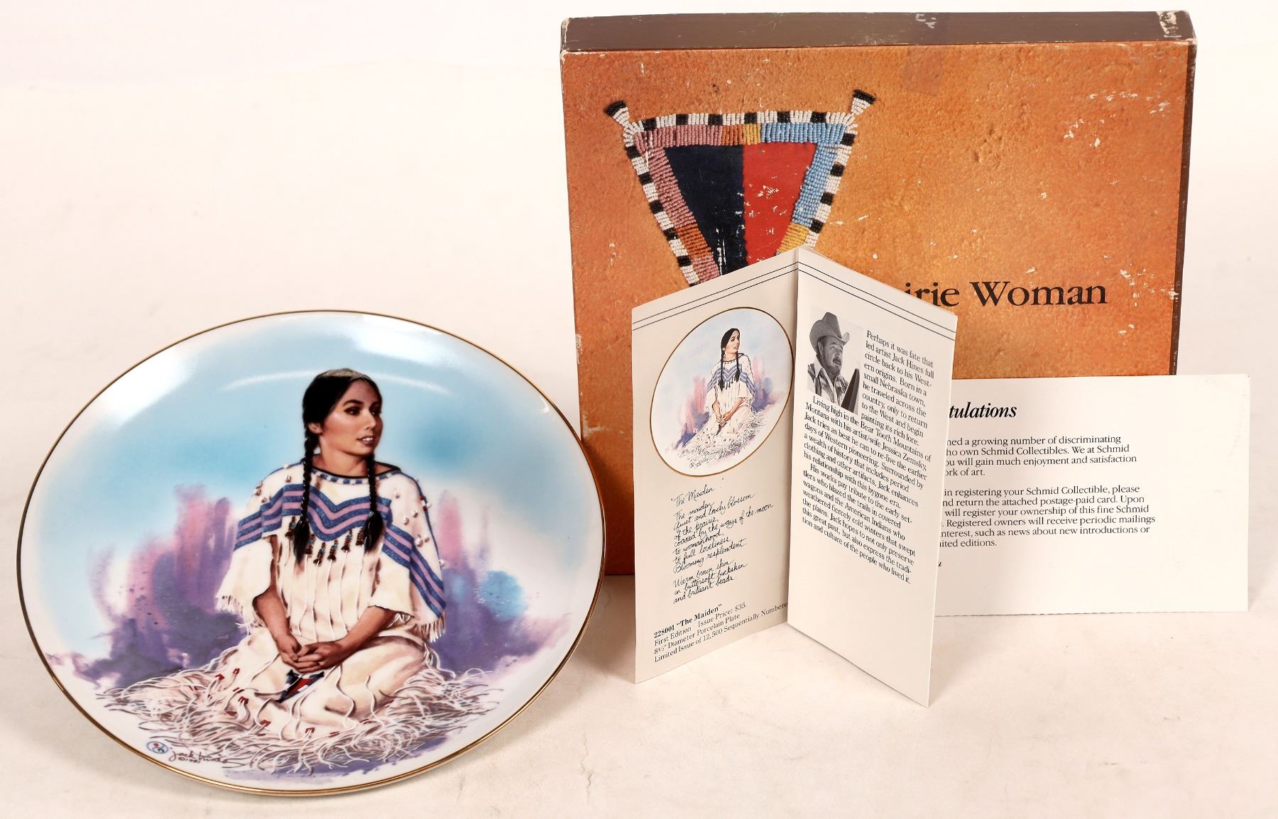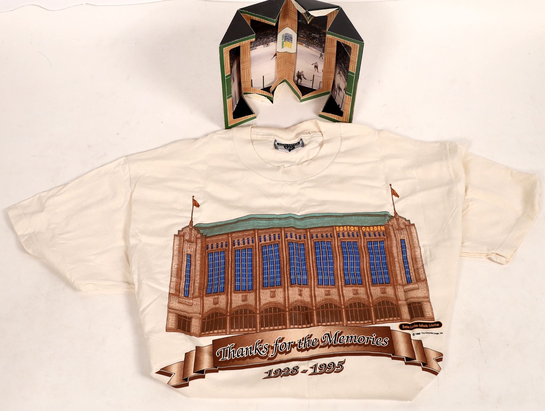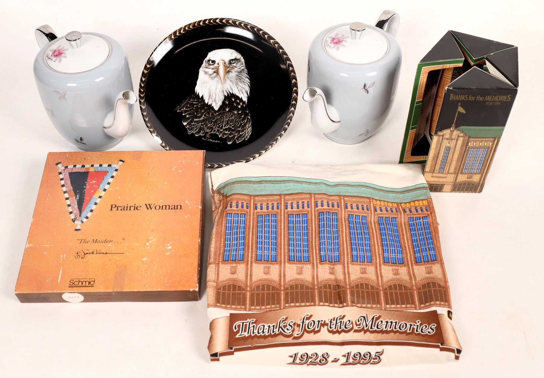 1995 Boston Garden Thanks for the Memories large unused T shirt in original box. Prairie Woman 8.5" plate by Jack Hines, #3606/12500 in box. 2 Seyei Fine China, Japan grey and white teapots with lids 5.75x9". 9.25" bald eagle plate by East Palestine China with .75" edge chip. Boston Massachusetts