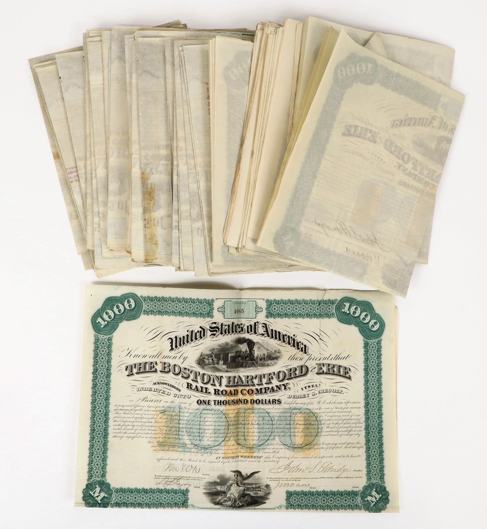 Over 75. I/U. Issued 1868. VF or better. Boston, Hartford & Erie Rail Road Co. Bonds, $1000 , 7 % bearer bonds. Some have revenue stamps. National BNC printer.
