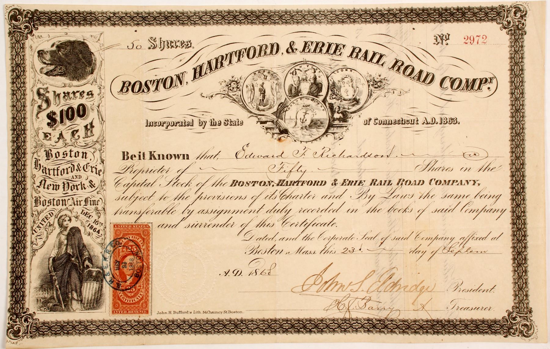 Uncancelled fifty shares of Boston, Hartford, & Erie Rail Road Company by Edward R. Richardson, number 2972 on September 23, 1868. Great Eye Appeal. Revenue Stamp. Printed by John H. Bufford's Lith. Appears Unlisted in Cox. Ken Prag Collection.
