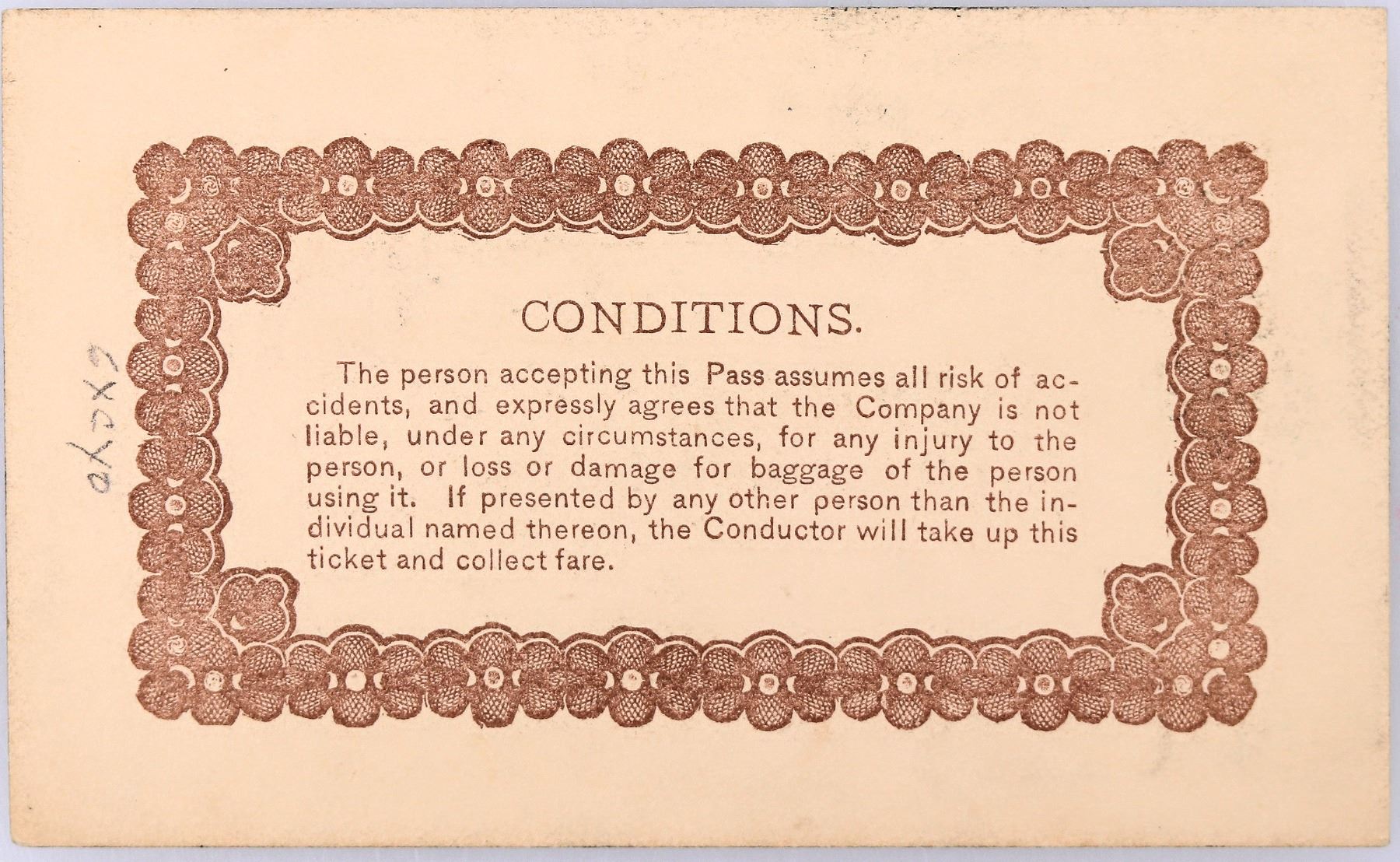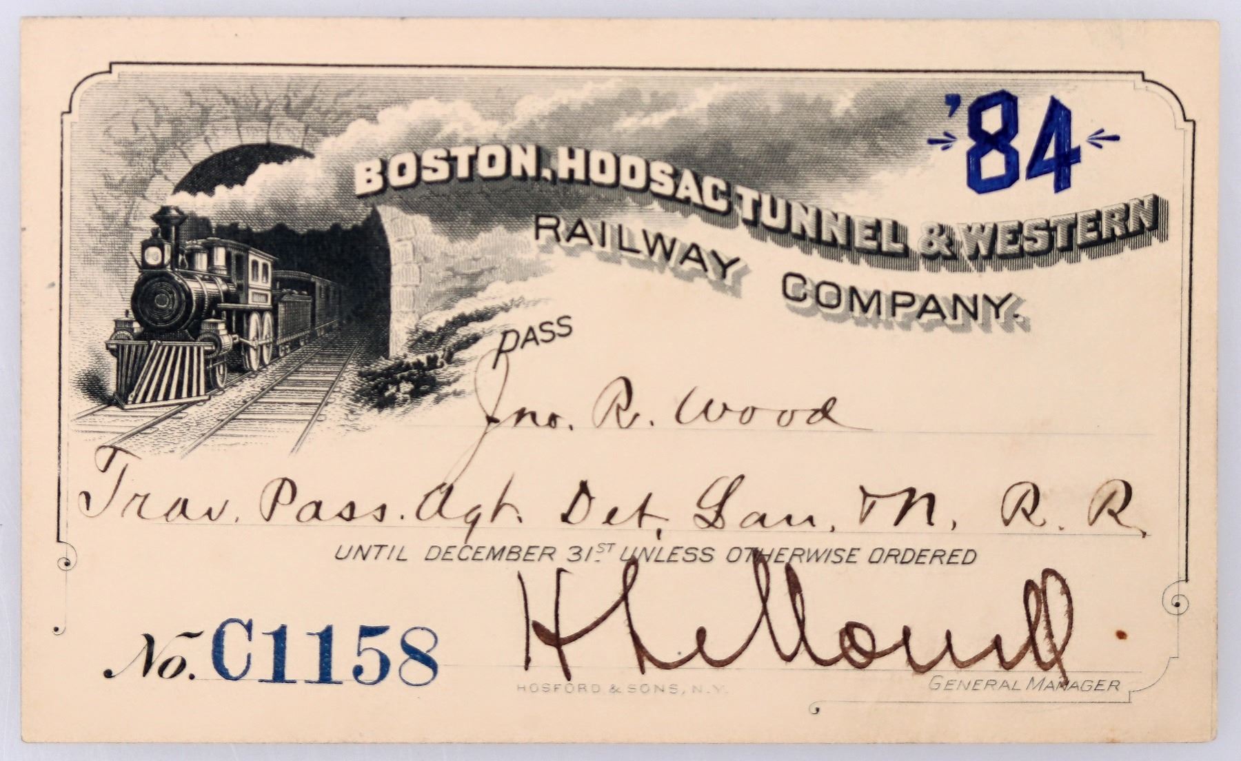 Pass no. C1158, issued to Jno. R. Wood for the year 1884. Signed by the general manager (illegible). Great design with a vignette of train exiting tunnel that takes up the top half of the pass. Printed by Hosford & Sons, NY. The Boston, Hoosac Tunnel and Western Railway was organized in 1877 to build from near the Massachusetts-Vermont border, where state ownership ended, parallel to the Troy and Boston Railroad to near Johnsonville, New York and then west via Schenectady to Rotterdam Junction on what became the New York, West Shore, and Buffalo Railway in 1883. The line was being planned as a part of the Delaware and Hudson Company's system and as part of the Erie Railroad system via the Delaware and Hudson Company's Albany and Susquehanna Railroad.