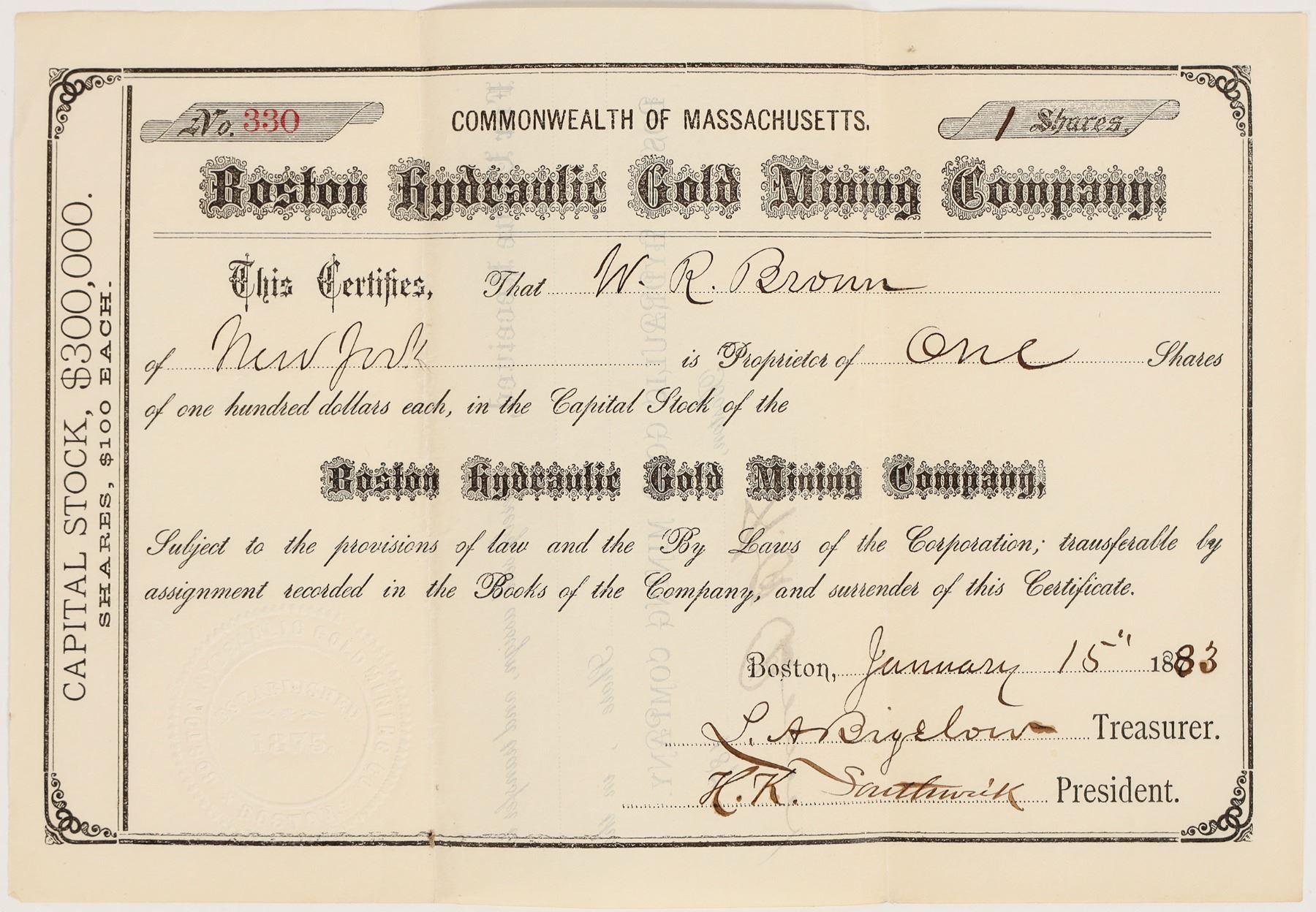 Boston Hydraulic Gold Mining Co. Stock Certificate, Calaveras County, CA 1883 [205252]