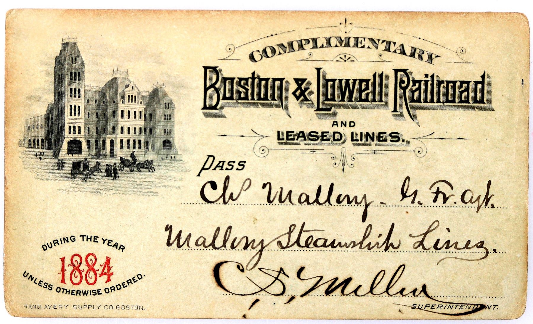 Complimentary pass for 1884 issued to C. Mallory of Mallory Steamship Lines. Signed by superintendent C.S. Miller(?). Black and red print on light green cardstock. Vignette of building with wagons in front. Printed by Rand Avery Supply Co., Boston. Soiling. This was one of the first railroads in North America and the first major one in the state of Massachusetts. Operated 1835-1887. Became the Boston & Maine Railroad.