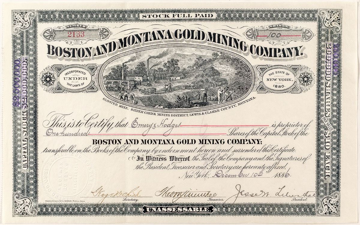 Inc. in 1880 on NY. Location: Gloster Mine, Silver Creek Mining District, Lewis & Clarke County, Montana. No. 2133. Issued for 100 shares to Emery Hodges on Dec. 10th, 1886. Signed by the president and secretary. Not cancelled. Fabulous vignette of mine and mill outdoor scene with many workers. Printed by Winkley, Dresser & Co., Boston. Folds, otherwise very clean. 7" x 11" City: Silver Creek Mining District State: Montana Date: 1886 ID: 36234