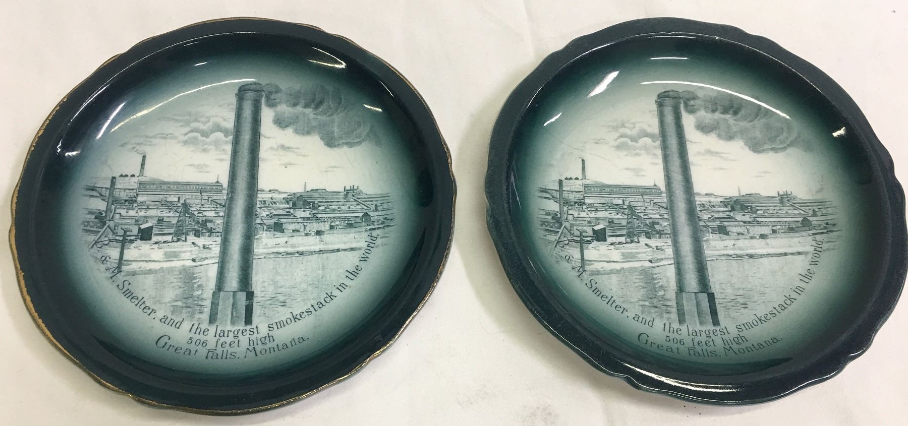 2 7.5" souvenir plates, 1 with goldish edge, non goldish one has 2 small chips on rear, not visible from front. "B & M Smelter, and the largest smokestack in the world".
