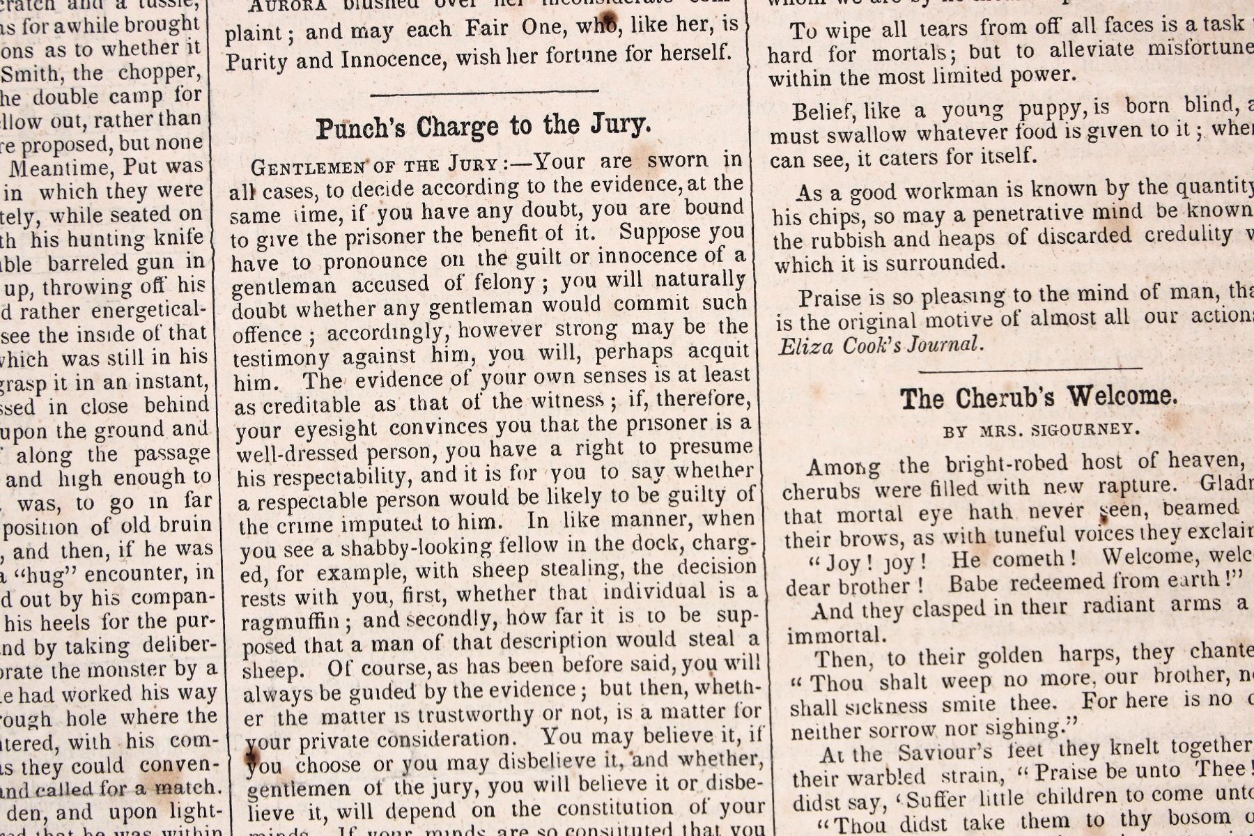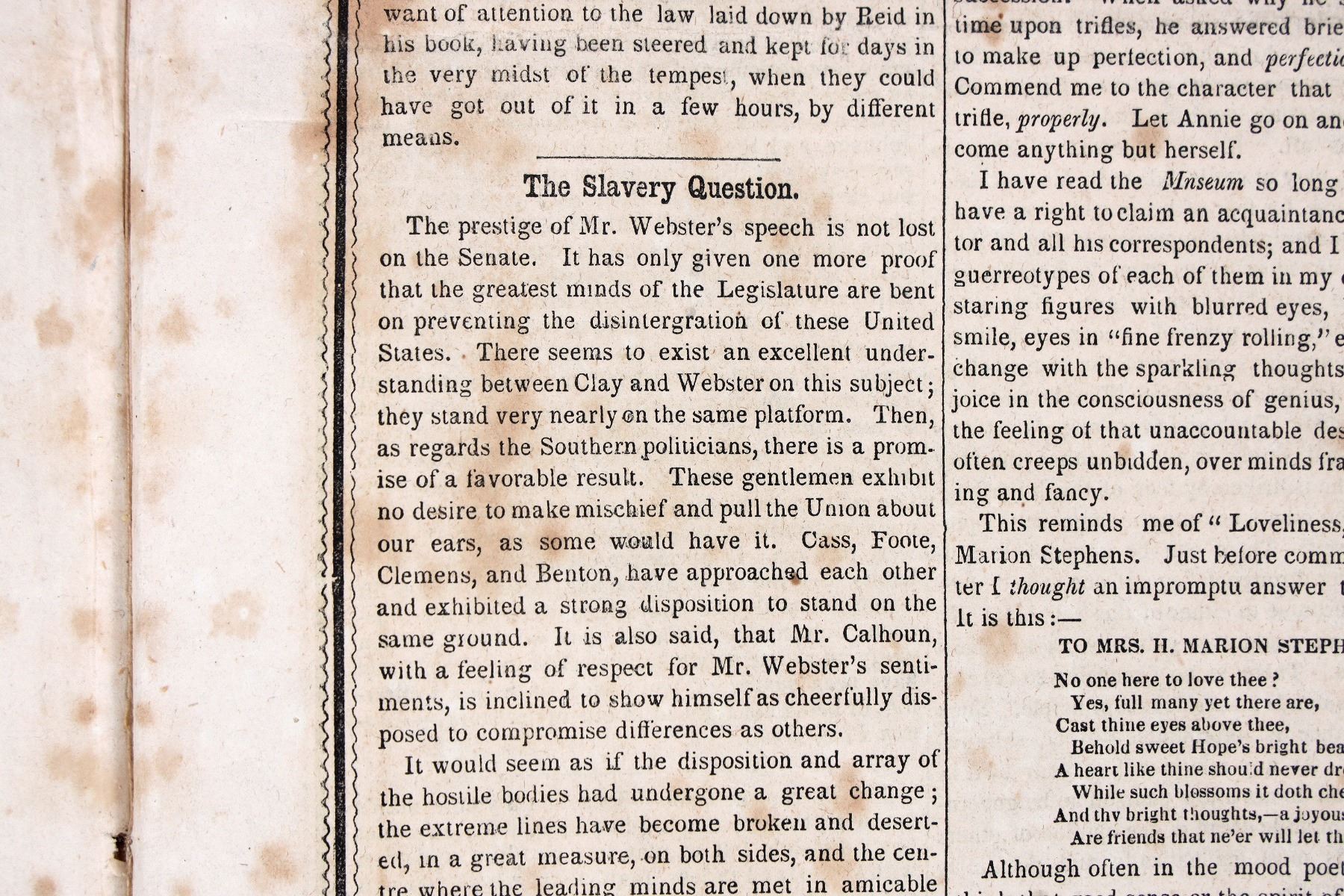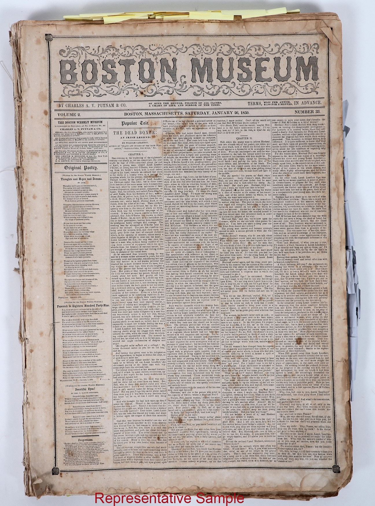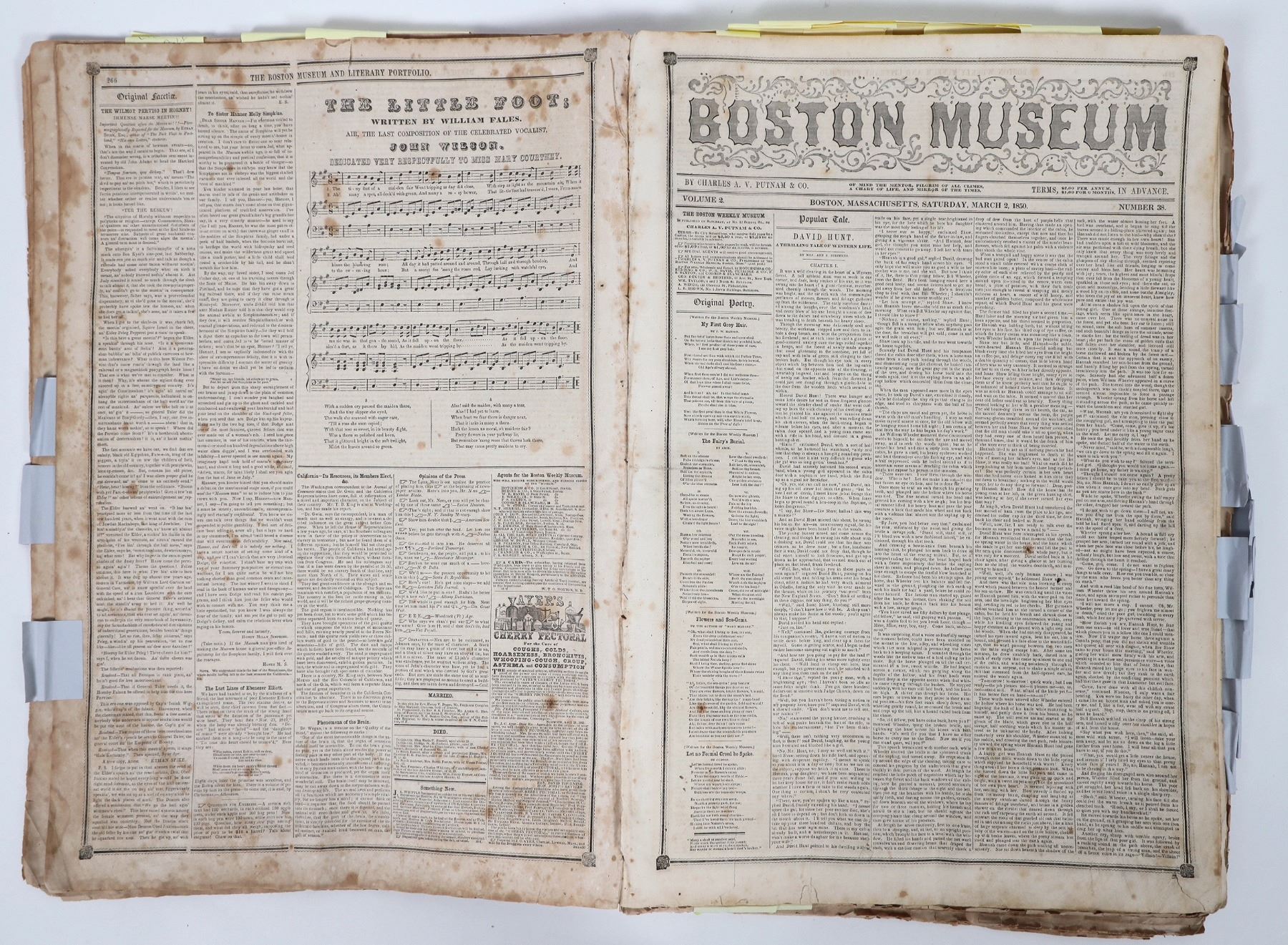 Pile of issued of the Boston Museum newspaper from 1849 and 1850 with thrilling news of the California Gold Rush that changed the world. Post it notes highlight the significant stories and there are dozens of them. The pile is two inches high, about a dozen issues or more.