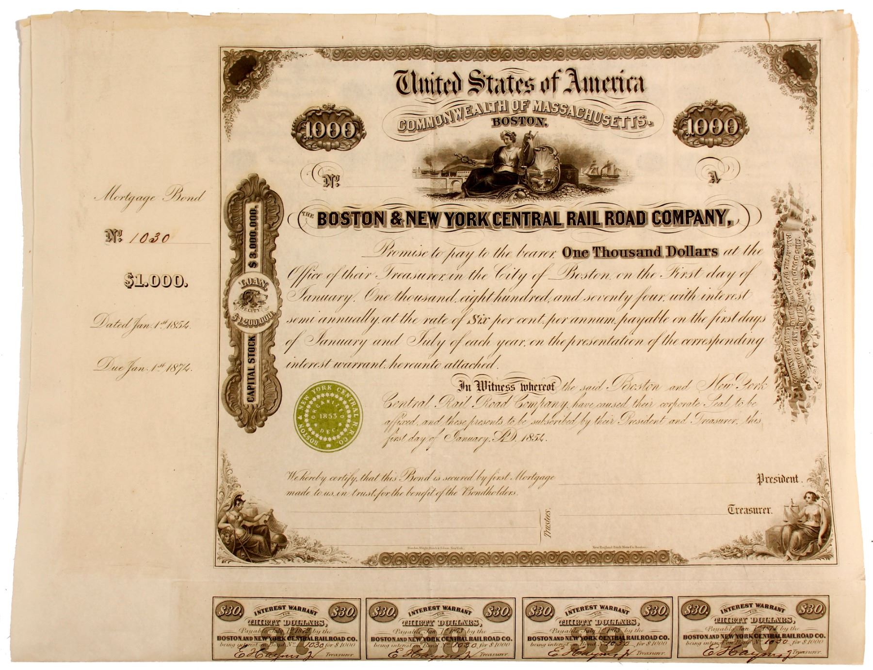 Unissued, $1,000 Boston & New York Central Rail Road Company bond with coupons, number 1030, dated January 1, 1854, due January 1, 1874. Railroad formed by combining Norfolk County, Southbridge and Blackstone and Norwich and Worcester Rail Roads. It opened In 1855. It as in debt and bought by. Boston, Hartford and Erie Railroad Company in 1863. Unlisted in Cox. Ken Prag Collection. State: City: Date: HWAC# 83116