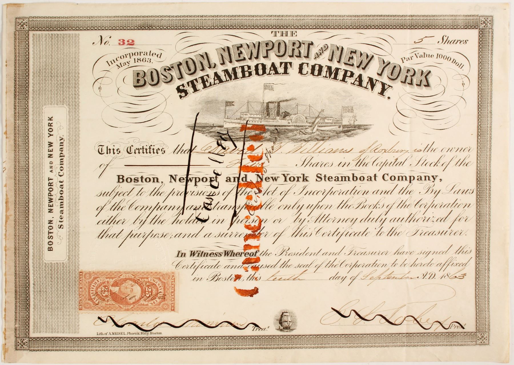 Cert. #32, issued at Boston for 5 shares in 1863. Great vignette of a paddle wheeler with a tall ship in the background. Revenue stamp affixed at the left. Part of stub attached at left border. Pen and stamp canceled. Very attractive shipping and steamboat certificate.