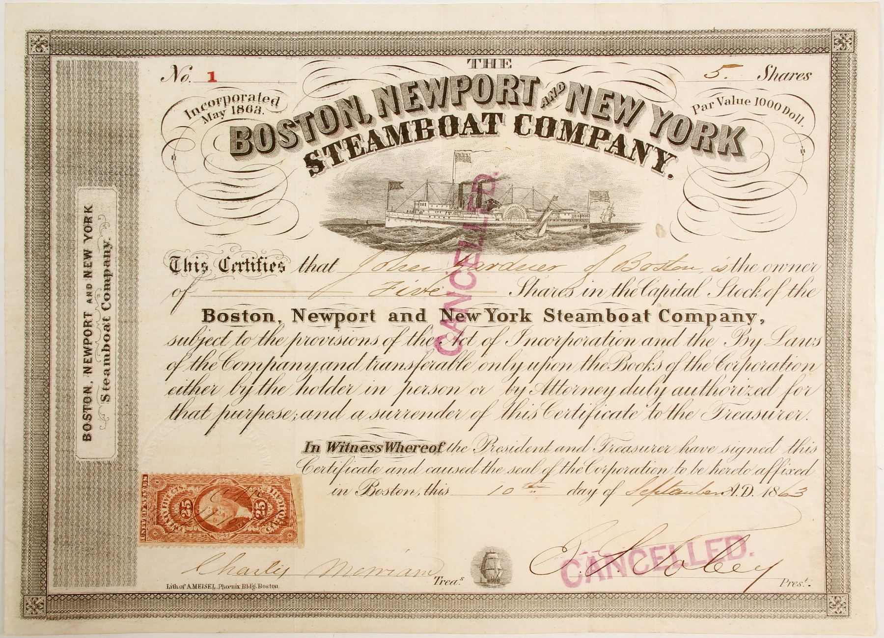 I/C #1 John Gardner 5 shares 1863. Steamer Metropolis vignette. Inc In MA. Signed by President Jabey? 25c revenue stamp. "The Bay State Steamboat Company was chartered in 1846, and operated regular service from New York to Fall River. The route retained the name "Fall River Line" through several changes of ownership. This connected to rail service from Fall River to Boston. Bay State sold its boats to a new company in 1863, the Boston, Newport & New York Steamboat Company, which moved its terminal to Newport, R.I. By 1869, the company had five boats, the Bay State, Empire State, Metropolis, Newport, and Old Colony. These steamers were all sold in turn to a competitor, the Narragansett Steamship Company, in 1869. The line was then acquired by the Old Colony Steamboat Company in 1874, and then New York, New Haven & Hartford Railroad Company in 1894. The Fall River Line became a division of the New England Navigation Company in 1906. Steamship service on this line ended in 1937." from rihs.org. Prag Collection.