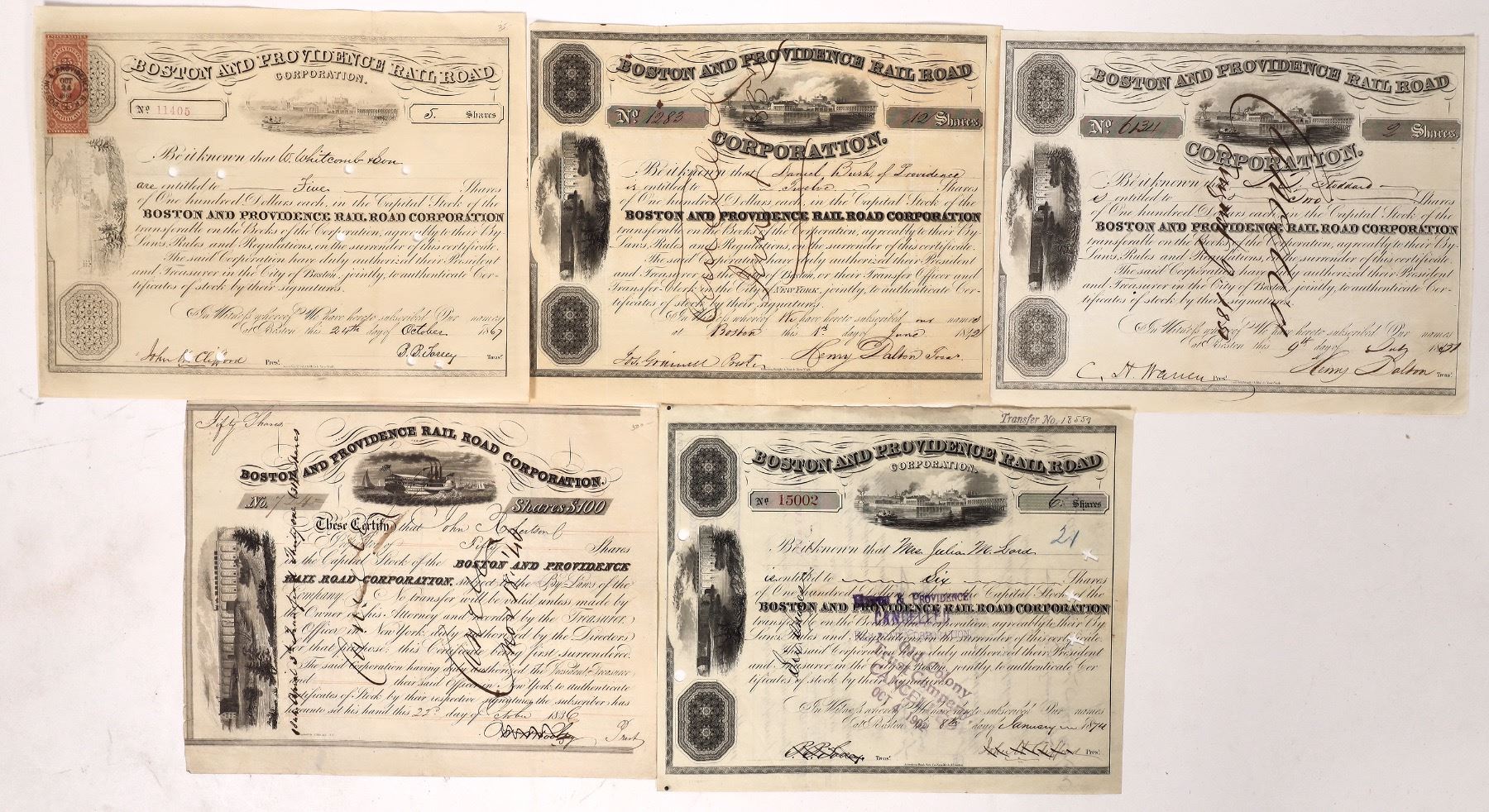 5 shares to W Whtcomb & Son 10/24/1867 signed by John Clifford i/c