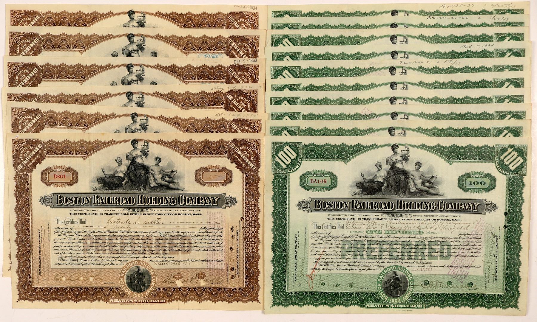 Lot of 16. Two different varieties. Punch cancelled. Issued 1911-1943. Green or brown borders, allegorical vignette. ABN. Folds, creases. 8 x 11.5" Inc. in Massachusetts. In 1909, The General Court of Massachusetts authorized the incorporation of the Boston Railroad Holding Company for the purpose of holding stock of the Boston and Maine Railroad which was in dispute. Ken Prag Collection