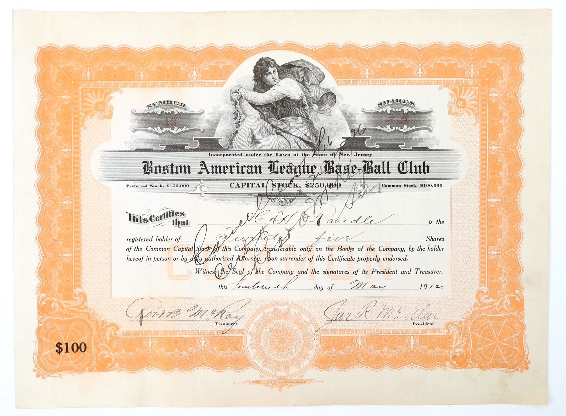 Stock certificate issued by the Boston American League Base-Ball Club (The Boston Red Sox). It is #13 for 25 shares. It is signed by treasurer Robert McRoy and club president James McAleer, a former major league pitcher and manager, who was an owner of the club from 1911-1913. McAleer's tenure as part-owner of the Red Sox came to a swift end. On July 15, 1913, McAleer became involved in a dispute with the AL president, Ban Johnson, when McAleer forced the resignation of Red Sox manager Jake Stahl, one of Johnson's closest friends. While McAleer claimed that he released Stahl because of a foot injury preventing Stahl from serving as a player-manager, rumors suggested that the two men had strong personal differences. Following a bitter quarrel with Johnson, McAleer sold his holdings in the Red Sox. His feud with Johnson turned out to be a lifelong affair, despite efforts taken by their mutual friend, Charles Comiskey, owner of the Chicago White Sox to smooth over the rift. McRoy was a secretary to Johnson and was placed in this position as secretary to sort of keep an eye on McAleer. After McAleer's "Retirement," McRoy returned to the league office. This certificate was issued to CH Randle on March 6, 1912. We could not find any info on Randle.