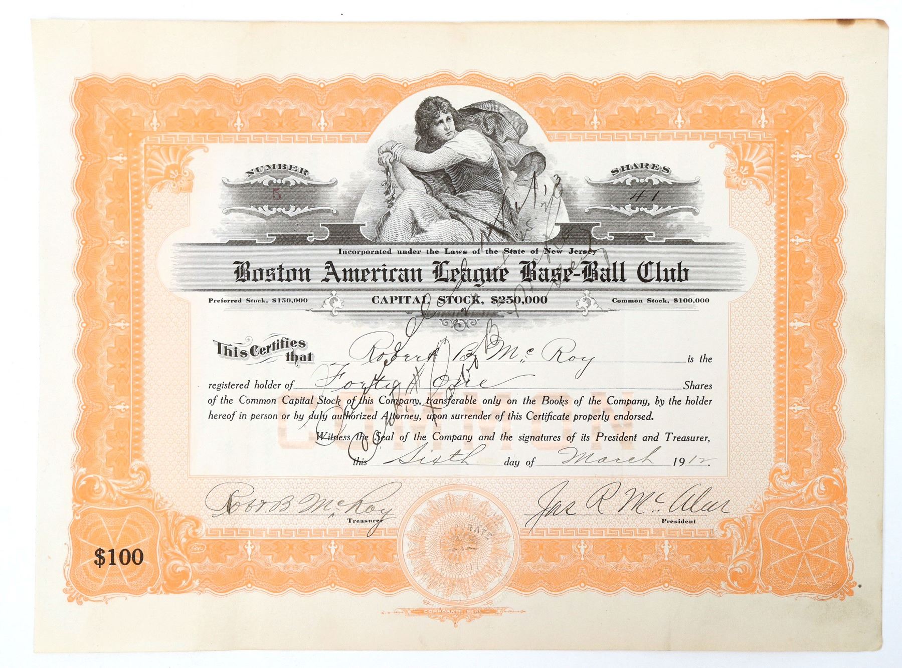 Stock certificate issued by the Boston American League Base-Ball Club (The Boston Red Sox). It is #5 for 41 shares. It is signed by treasurer Robert McRoy and club president James McAleer, a former major league pitcher and manager, who was an owner of the club from 1911-1913. McAleer's tenure as part-owner of the Red Sox came to a swift end. On July 15, 1913, McAleer became involved in a dispute with the AL president, Ban Johnson, when McAleer forced the resignation of Red Sox manager Jake Stahl, one of Johnson's closest friends. While McAleer claimed that he released Stahl because of a foot injury preventing Stahl from serving as a player-manager, rumors suggested that the two men had strong personal differences. Following a bitter quarrel with Johnson, McAleer sold his holdings in the Red Sox. His feud with Johnson turned out to be a lifelong affair, despite efforts taken by their mutual friend, Charles Comiskey, owner of the Chicago White Sox to smooth over the rift. McRoy was a secretary to Johnson and was placed in this position as secretary to sort of keep an eye on McAleer. After McAleer's "Retirement," McRoy returned to the league office. This certificate was issued to Robert B McRoy on March 6, 1912. There is a small bit of upper right toning.