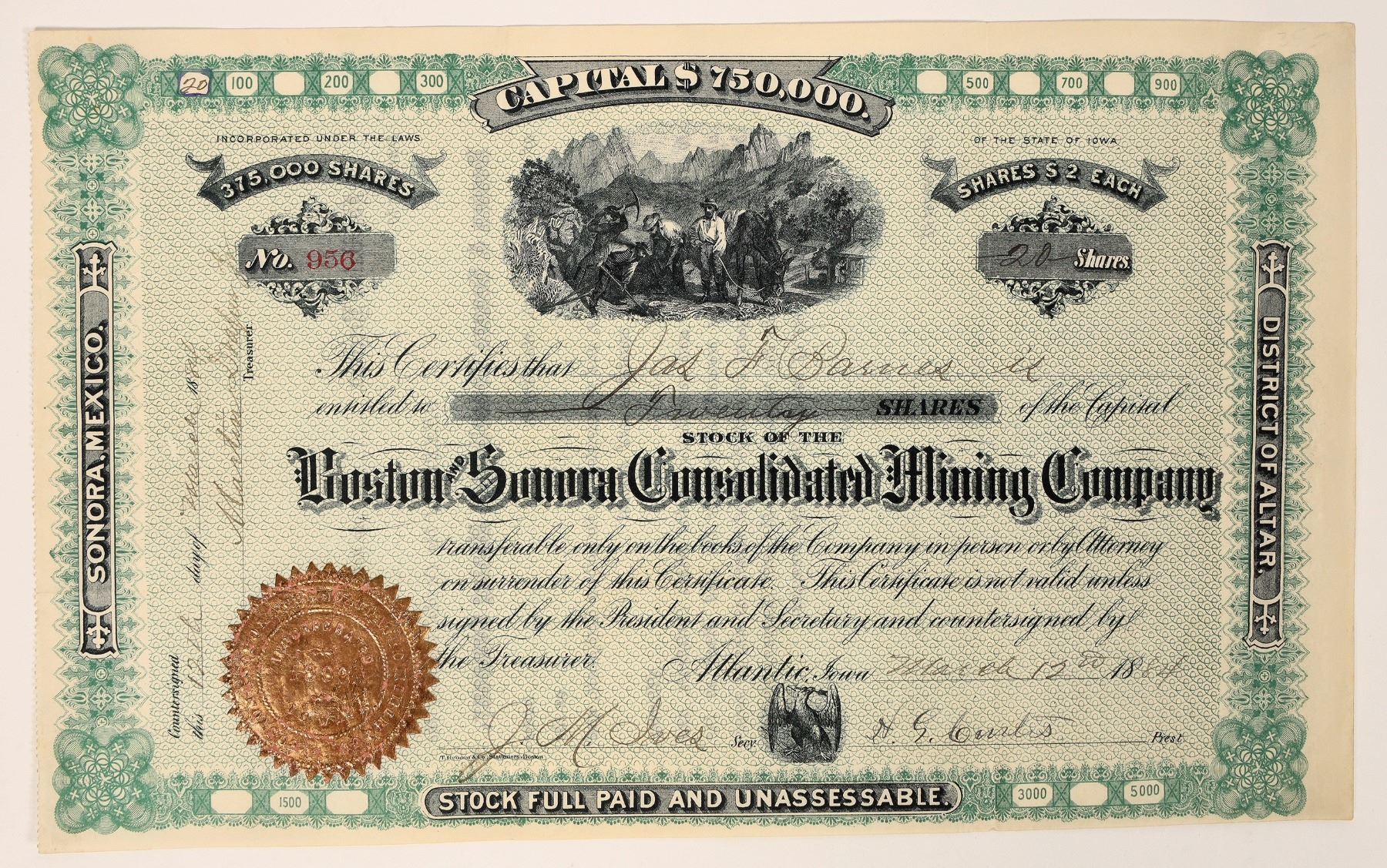 Issued 1884 Boston & Sonora Mining stock with miners & horse vignette.[ Mexico