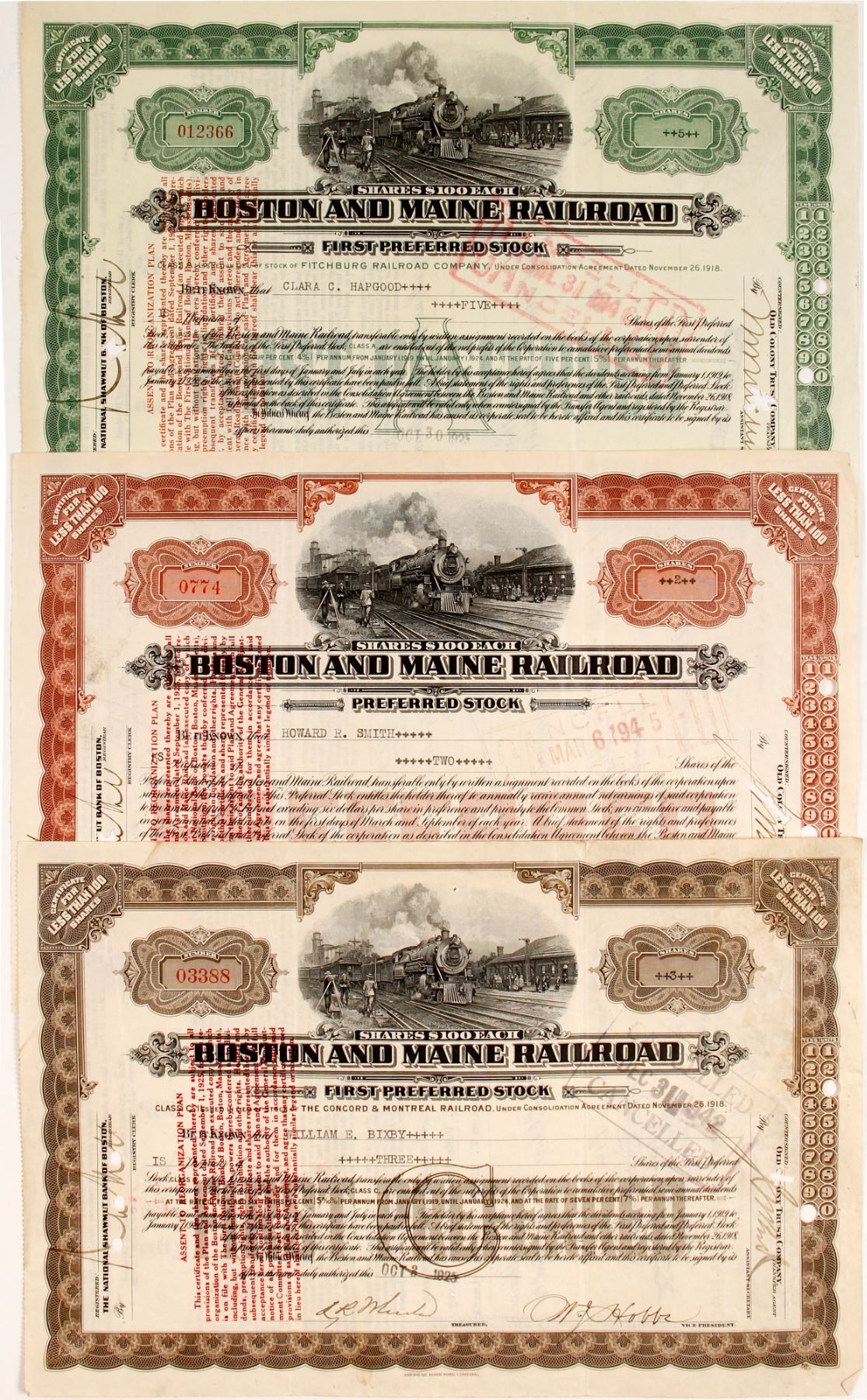 Three cancelled stocks from Boston and Maine Railroad signed by W. J. Hobbe. Printed by American Bank Note. 1) 3 shares of first preferred stock with revenue stamps for William E. Bixby on October 3, 1925. Cancelled Dec 31, 1942. 2) 2 shares of preferred stock for Howard R. Smith on September 23, 1924 canceled March 6, 1945. 3) 5 shares of first preferred stock for Clara C. Hapgood signed by W. J. Hobbe. The Boston and Maine Railroad started its' first section of rail in 1840. In 1842 it merged with the Maine, New Hampshire & Massachusetts and Boston & Portland. Not listed in Cox. Ken Prag Collection.