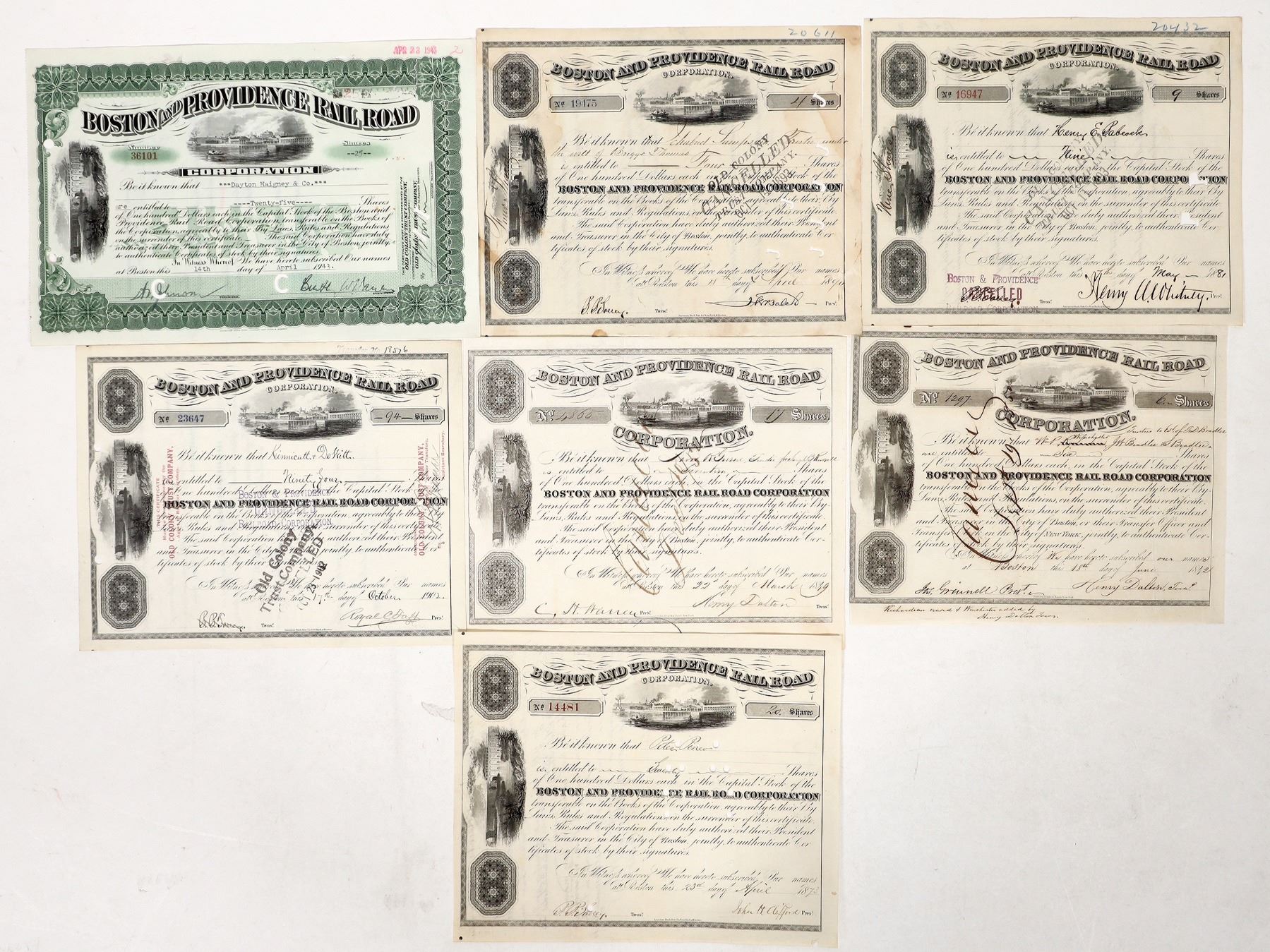 1840-1943 Boston and Providence RR Stocks with 7 different presidents signatures. 1849 has light stain, 1840 has heavier stains. Please inspect.