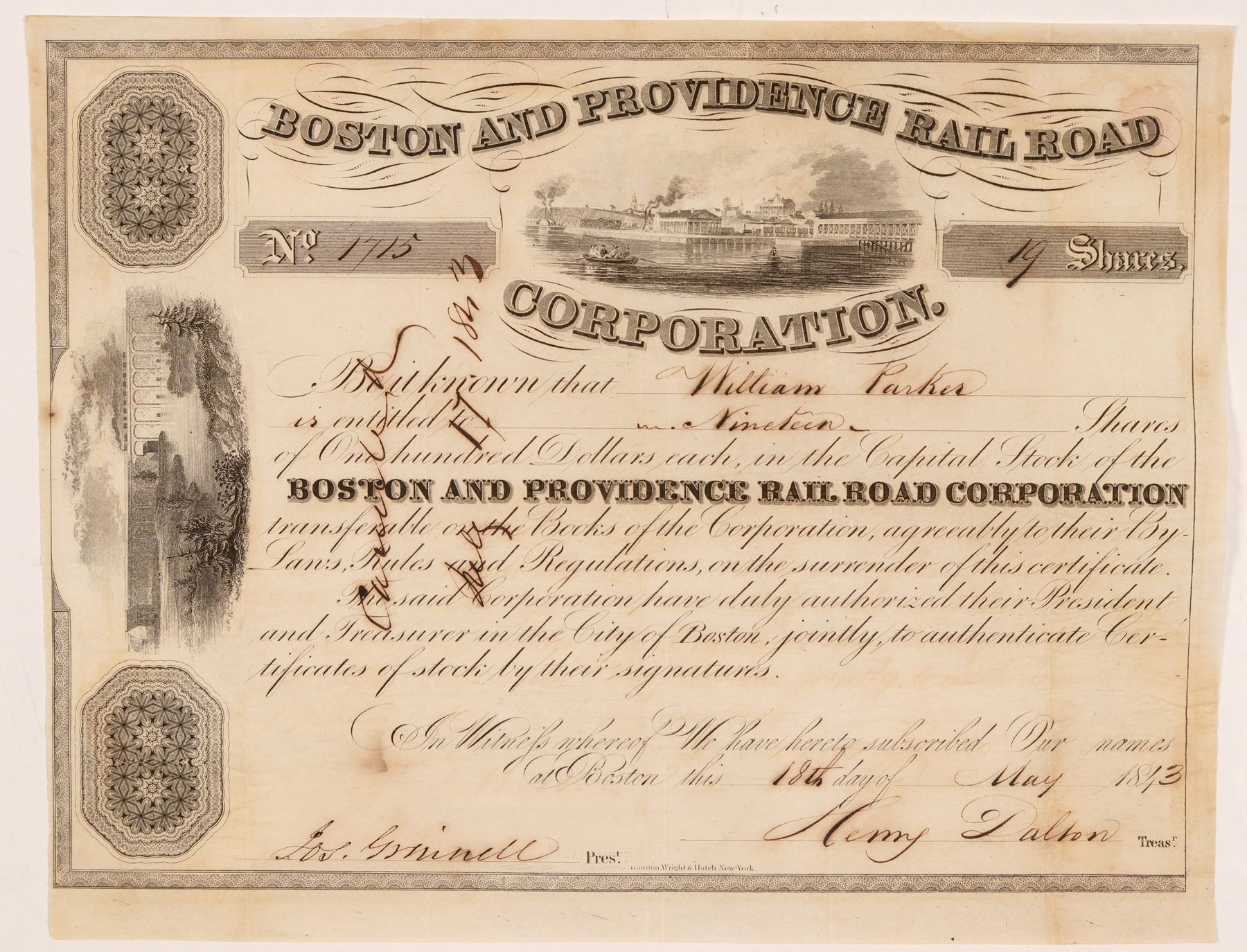 19 cancelled shares of Boston and Providence Rail Road stock cert. # 1715 issued to William Parker on May 18, 1843. Signed by president and treasurer. Vignettes on left side of railroad crossing over bridge and 2 of designs on either side. Printed: Kawdon, Wright & Hatch, NY. Boston and Providence Railroad ran in Massachusetts and Rhode Island which connected Boston and Providence. Opened in 2 sections, one in 1834 and the other in 1835. Branches were built: Dedham - 1834, Stoughton - 1845, and North Attleboro - 1871. In 1888 acquired by Old Colony Railroad. Line became the New Haven's primary mainline to Boston. Became part of the Penn Central system in 1969; the section in Massachusetts was purchased by the state in 1973, while Amtrak acquired the Rhode Island section in 1976. The line was electrified in 2000 and now part of Amtrak's Northeast Corridor.