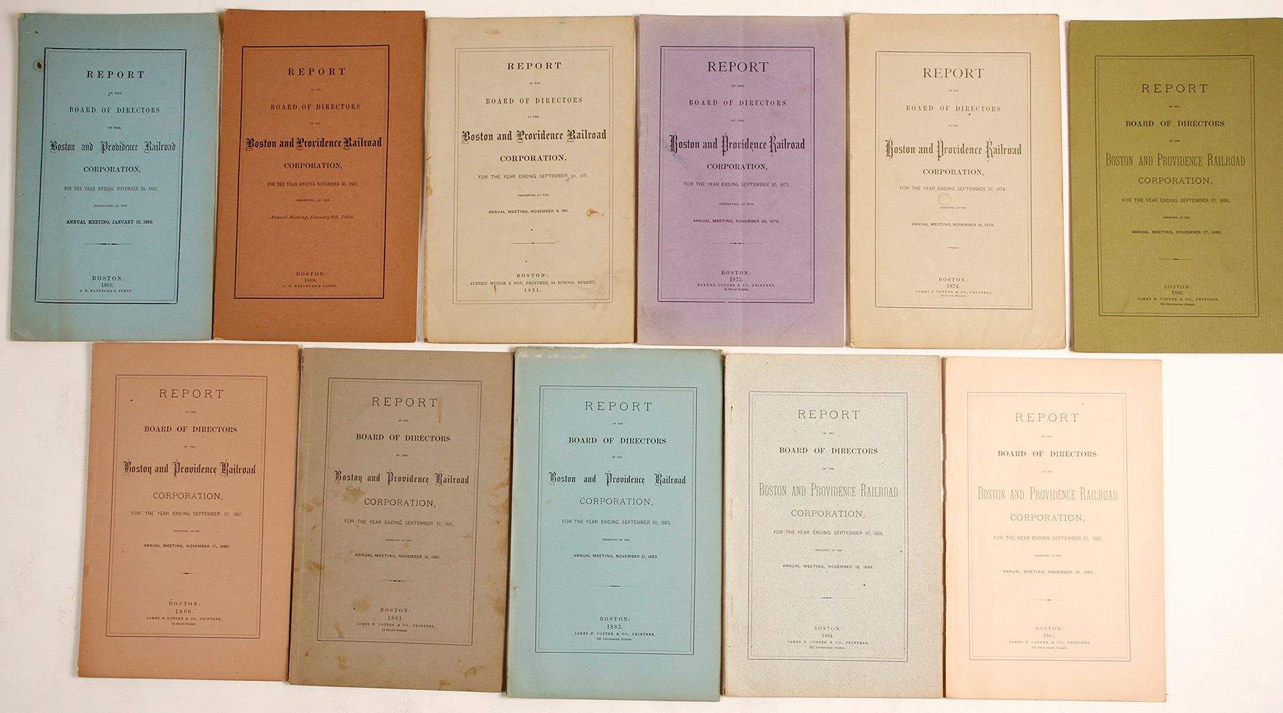 Eleven reports: 1866, 68, 71,72, 74, 80, 81, 83, 84, 85, 86. Various conditions. 1866 is 12 pages with lots of charts on the financial earnings of the years. 1886 is also a financial report, but includes list of equipment, history of what was down this year, etc. Very valuable historical reference for this railroad that was one of the first in the United States.