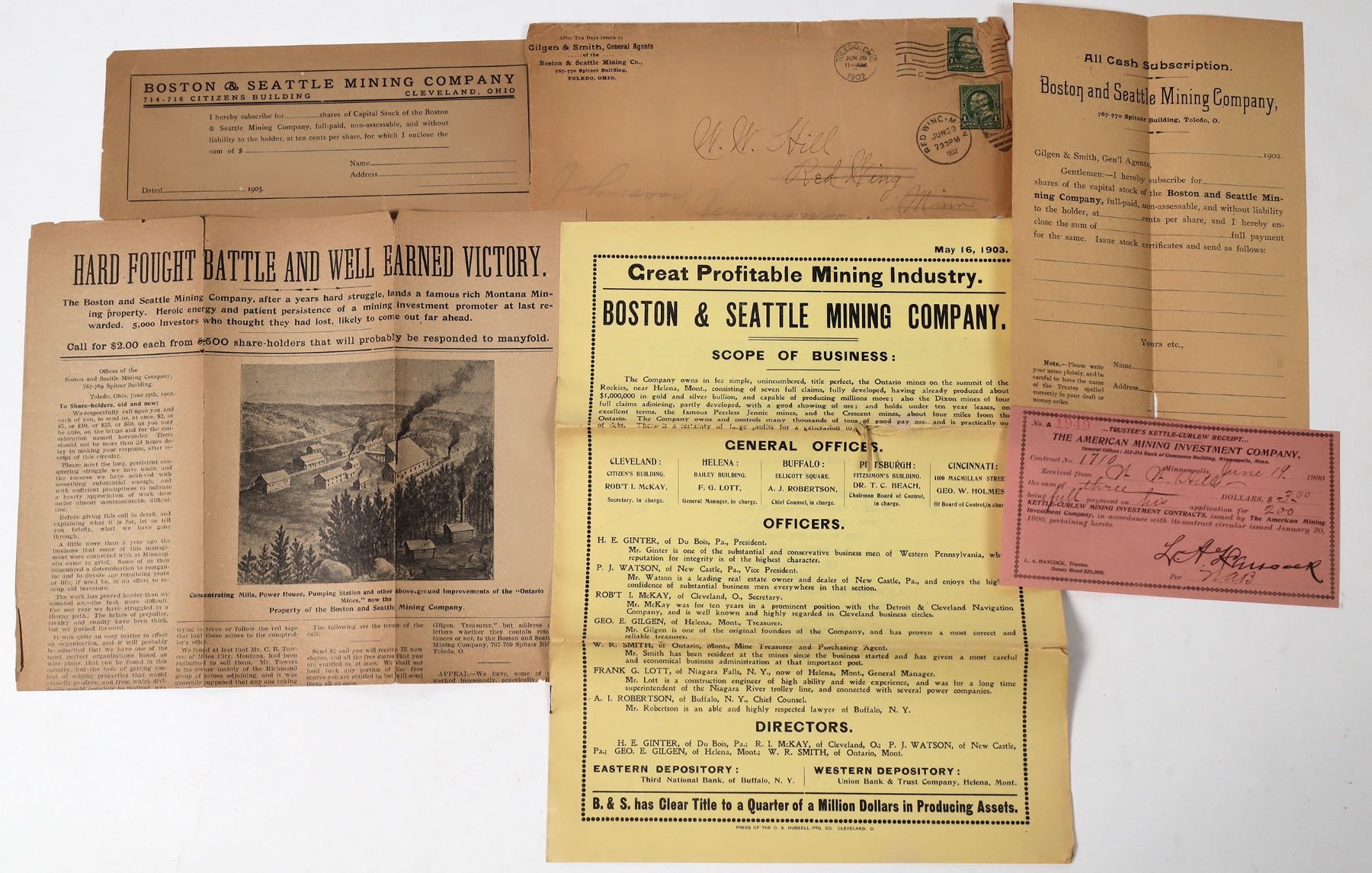 4 promo pieces from Boston and Seattle Mining for a mine in Montana. Shareholder report, unused subscription form, 1902 cover, 8 page promo paper with claim map and photos. 1900 receipt American Mining Investment Co.