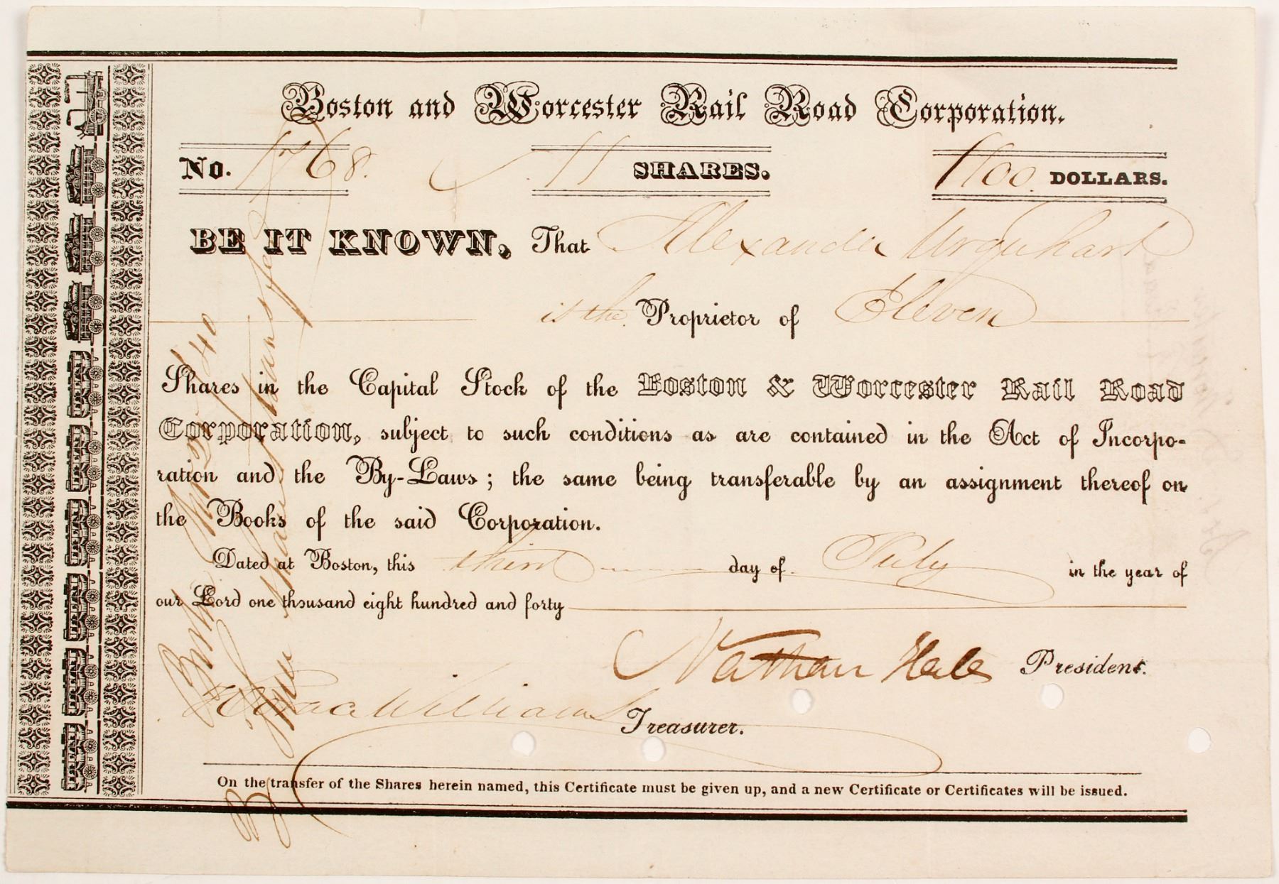 Cancelled eleven capital shares of Boston and Worcester Rail Road Corporation, Number 1768. Signed by Nathan Hale (not of Revolution War fame), president on July 3, 1840. Shipping milk by rail was started after the opening of the Boston & Worcester line. Milk cars were attached to passenger trains. Railroad and dairy farmers continued their joint venture into the 20th century. Ken Prag Collection. State: City: Date: HWAC# 83134
