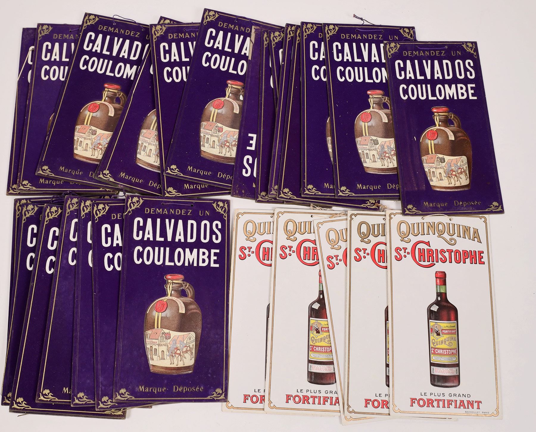 Dealer lot of over 35 poster boards advertising French alcohol bottles. About 30 for Calvados Coulombe; five for Quinquina St. Christophe. Placards are 6 x 11inches, with the bottles in relief, with a string for hanging and very colorful. City: State: Date: