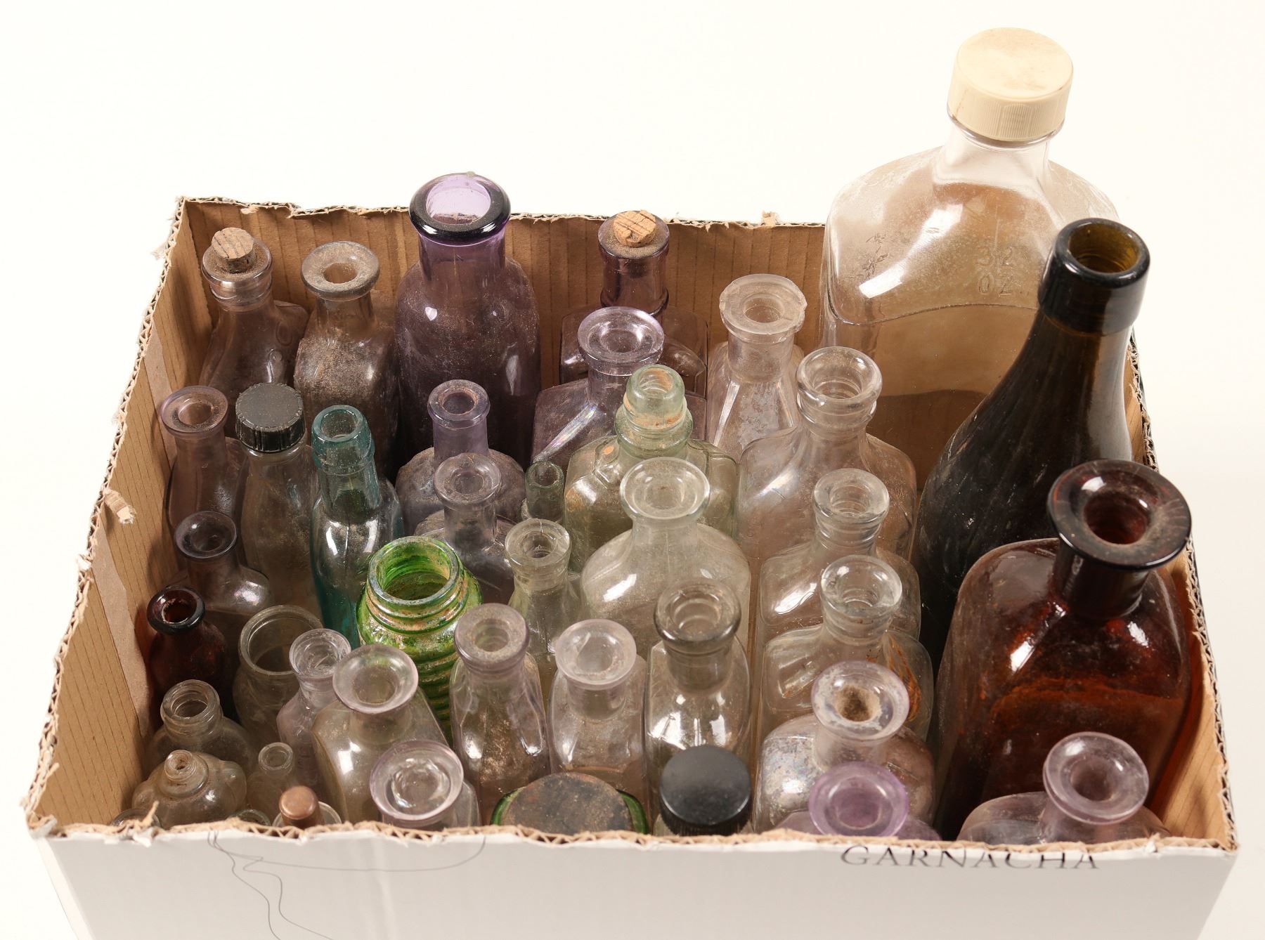 Here we have a nice small collection of early glass. Starting with a black glass ale from the 1880's, to a whole bunch of medicine bottle from the pharmacies. All sizes and shapes, and colors. Great for decorations, or for all your window sills. Mostly all in good condition, but a few have lip chips.Dig through the box, and find your treasure !!. Nice starter collection. ( RH). Geff Pollock Collection
